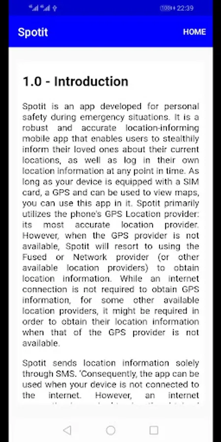 Spotit is an app developed for personal safety during emergency situations. It is a robust and accurate location-informing mobile app that enables users to stealthily inform their loved ones about their current locations, as well as log in their own location information at any point in time. As long as your device is equipped with a SIM card, a GPS and can be used to view maps, you can use this app in it. Spotit primarily utilizes the phone's GPS Location provider: its most accurate location provider. However, when the GPS provider is not available, Spotit will resort to using the Fused or Network provider (or other available location providers) to obtain location information.