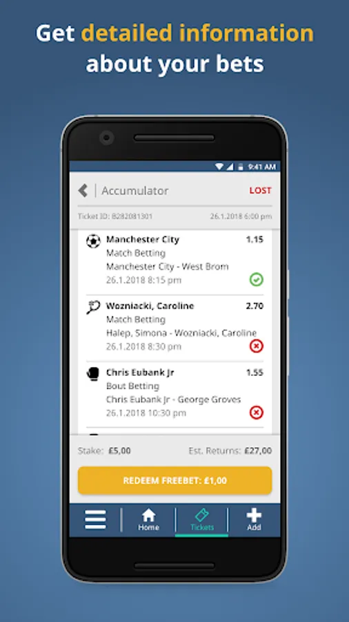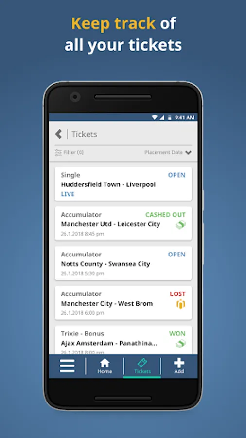 Check your tickets status anytime on-the-go, watch the live match flow to follow in-play events in real time or cash out early if your bet turns against you.