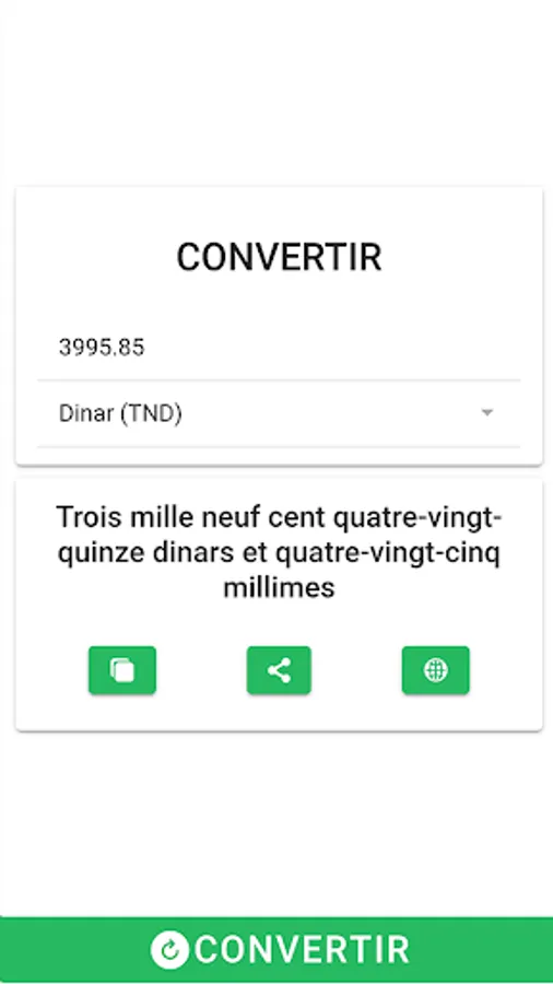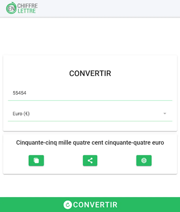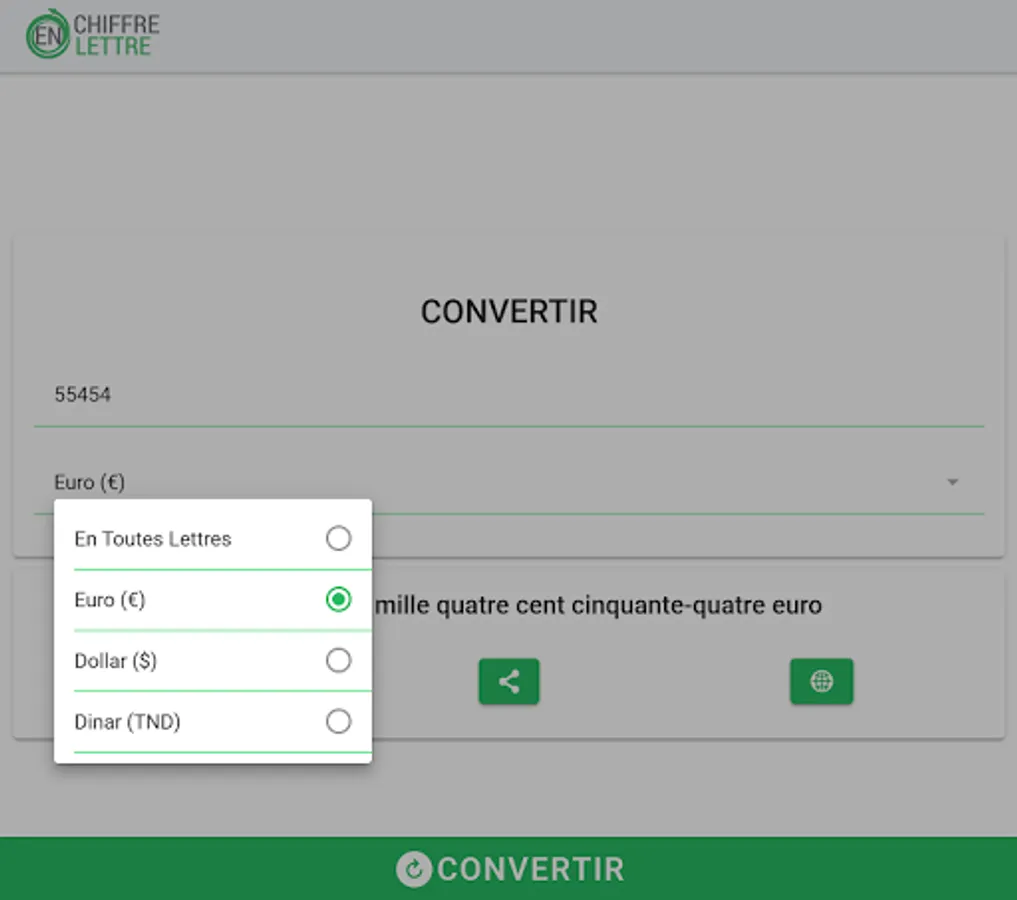 - Convert the amount in Euros, American Dollar, Canadian Dollar, Tunisian Dinar, Algerian Dinar, Swiss Franc and Moroccan Dirham in all letters