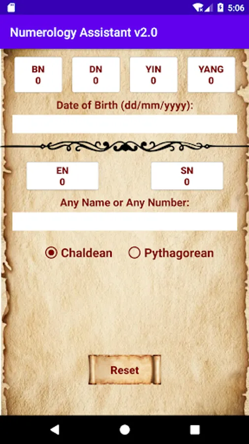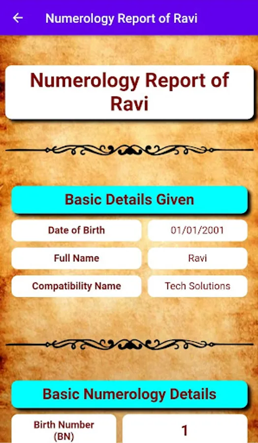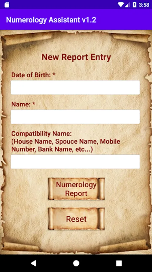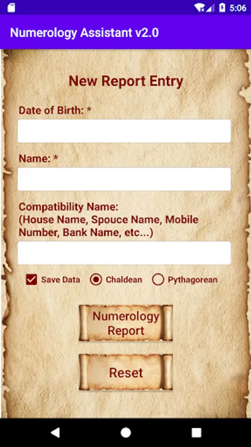 A handy numerology app which produces report based on Date Of Birth, Full Name and/or Compatibility Name.