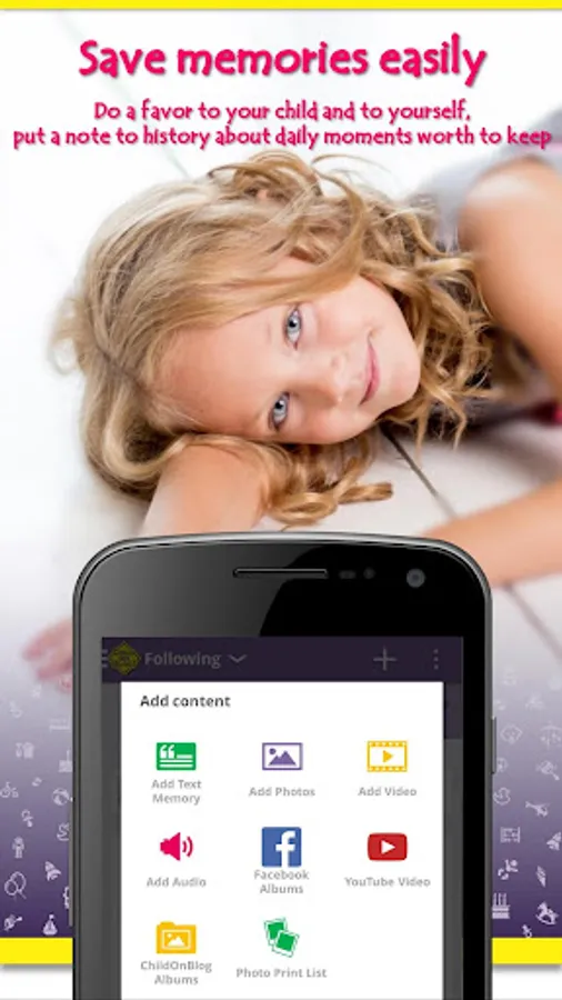 Photo and video contents previously uploaded to the other platforms like Facebook and Youtube, can be used, managed and shared like they have been uploaded to Child On Blog at the first hand.