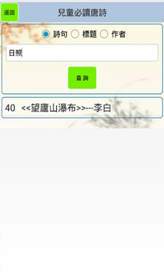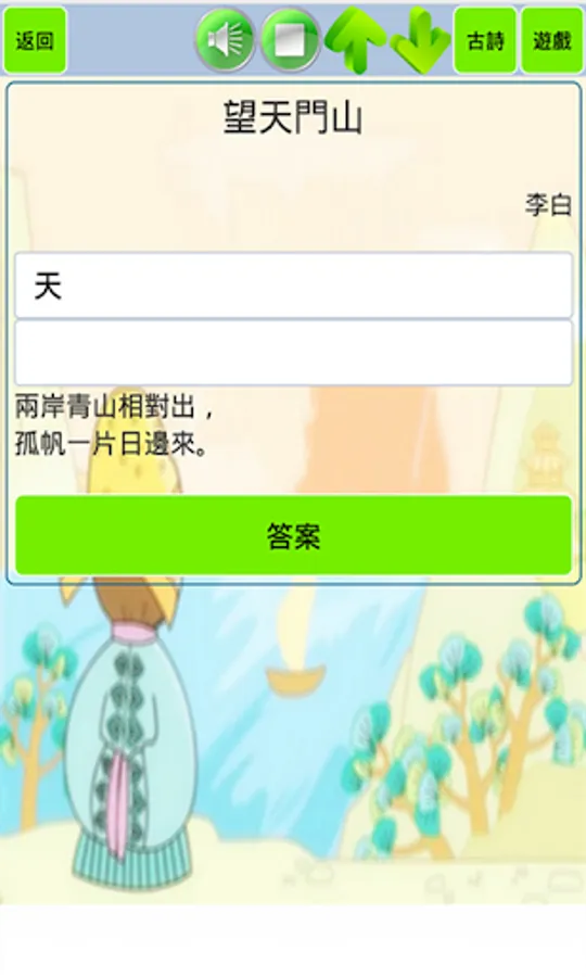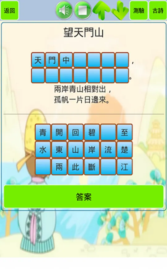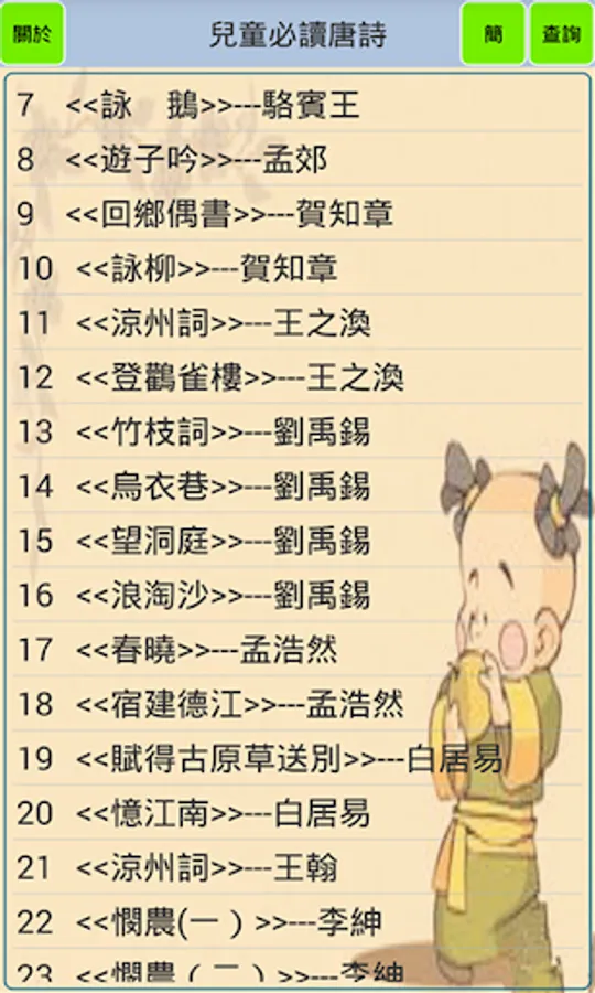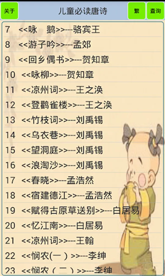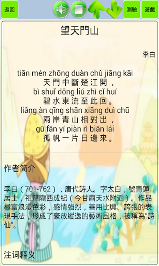 "Tang Poems for Children" aims to help young children learn ancient poems. The software contains a total of 80 classic poems from the Tang, Song, Ming and Qing dynasties. These ancient poems are a must for Chinese elementary school students. All ancient poems are provided with pinyin and reading, as well as poem annotations. Poetry-filling game is a major feature of the software, which can not only increase interest in memorization, but also learn Chinese characters. In addition, the software also provides a quiz link to consolidate what you have learned, and the query mode can query ancient poems by author, title, and verse.