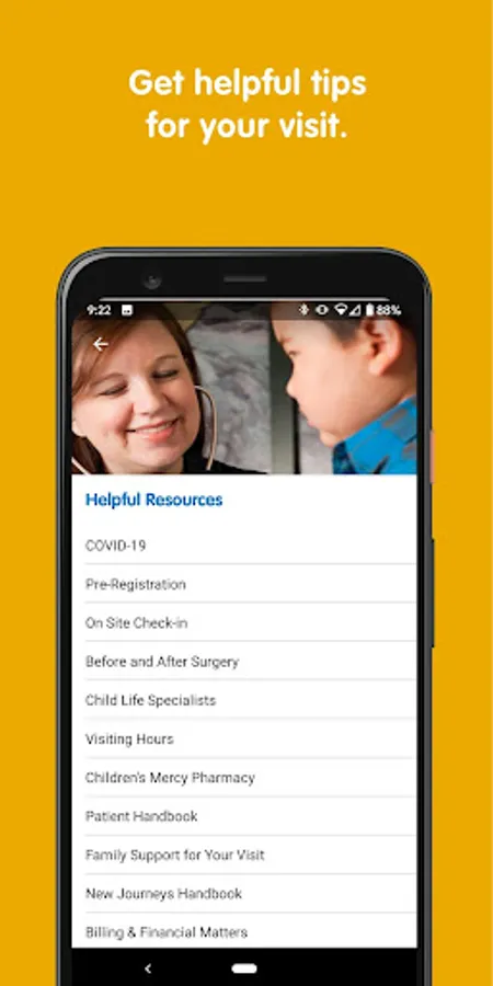 You can use the app’s “Find a Doctor” feature to research the many skilled providers at Children’s Mercy. After your visit, securely access medical records and communicate with your care team through MyChildrensMercy, our patient portal. Log in to your existing account through the app or find out how to get connected to the portal.