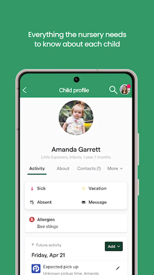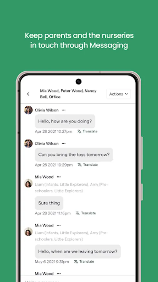 3. Messaging and Communication: The app facilitates direct and secure messaging between parents and the school. This allows parents to easily communicate with the school, ask questions, provide instructions, or discuss any concerns related to their child's care.