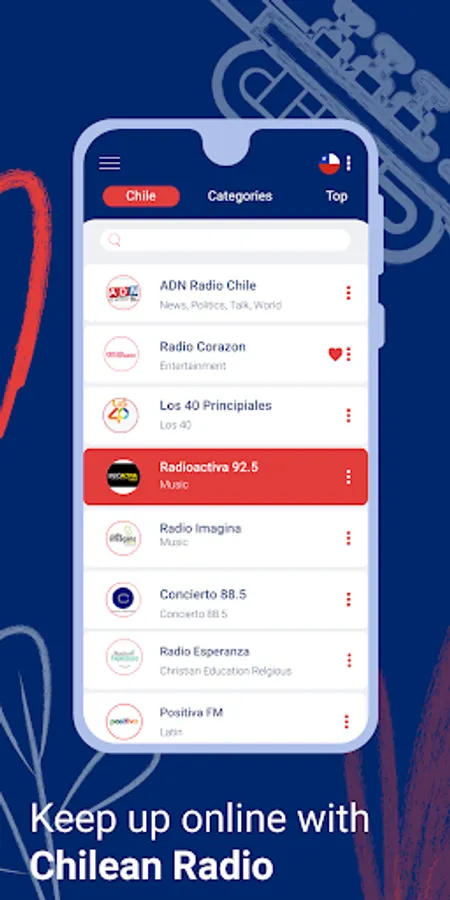 The following Chile Radio Live FM Player (Free Radio Stations: FM Radio & AM Radio) for Android is programmed to stream broadcasts live from Chile. Chile Radio Live FM Player Android Radio allows you to listen and enjoy numerous genres of music such as classical, rock, pop, instrumental, hip-hop, gospel, as well as Chile songs, talks, comedy, shows, concerts, gospel shows, Chile national music, Chile news and other kinds of programs. Due to this Live Chile Radio Live Internet Radio / Free radio stations: FM Radio & AM Radio app (Chile streaming) you are enabled to enjoy all the types of music as well as entertaining and informative Chile programs, songs, live Chile News and other streaming. You will be aware of what is going on in Chile by listening to our Android radio Internet Radio / Free radio stations: FM Radio & AM Radio app streaming and broadcast live.