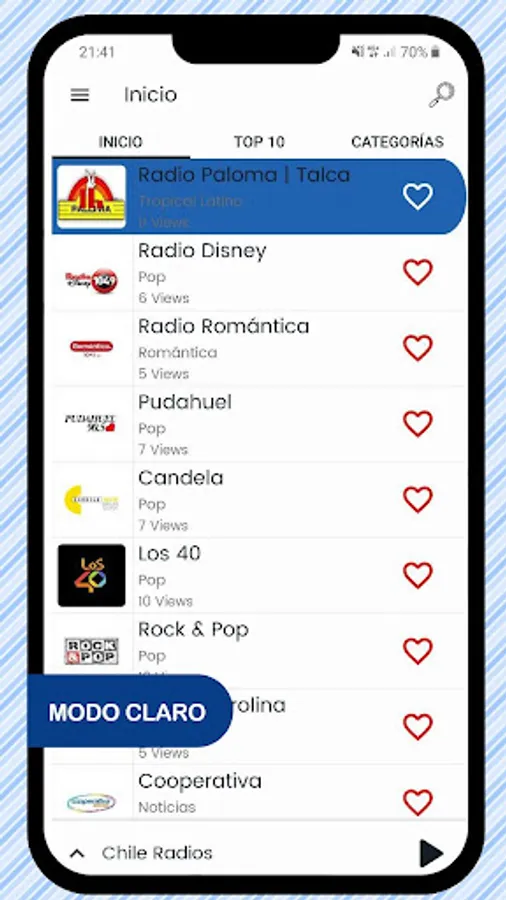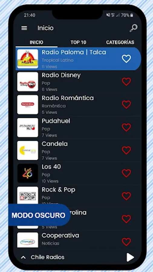 In this application you will find the main radio stations in Chile. You can also record your programs or songs that are playing, schedule the shutdown and save the stations you like to favorites.