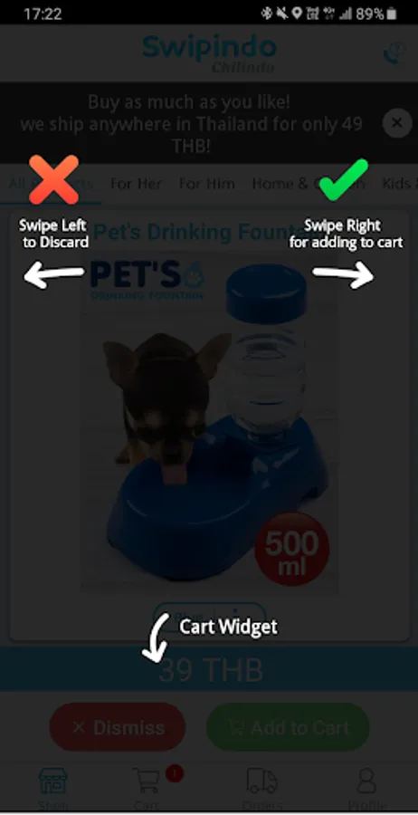 Swipindo offers you a fun way to shop and discover new interesting products on-the-go - with just one finger. Swipe right if you like the item, or left if you don't - shopping has never been easier!