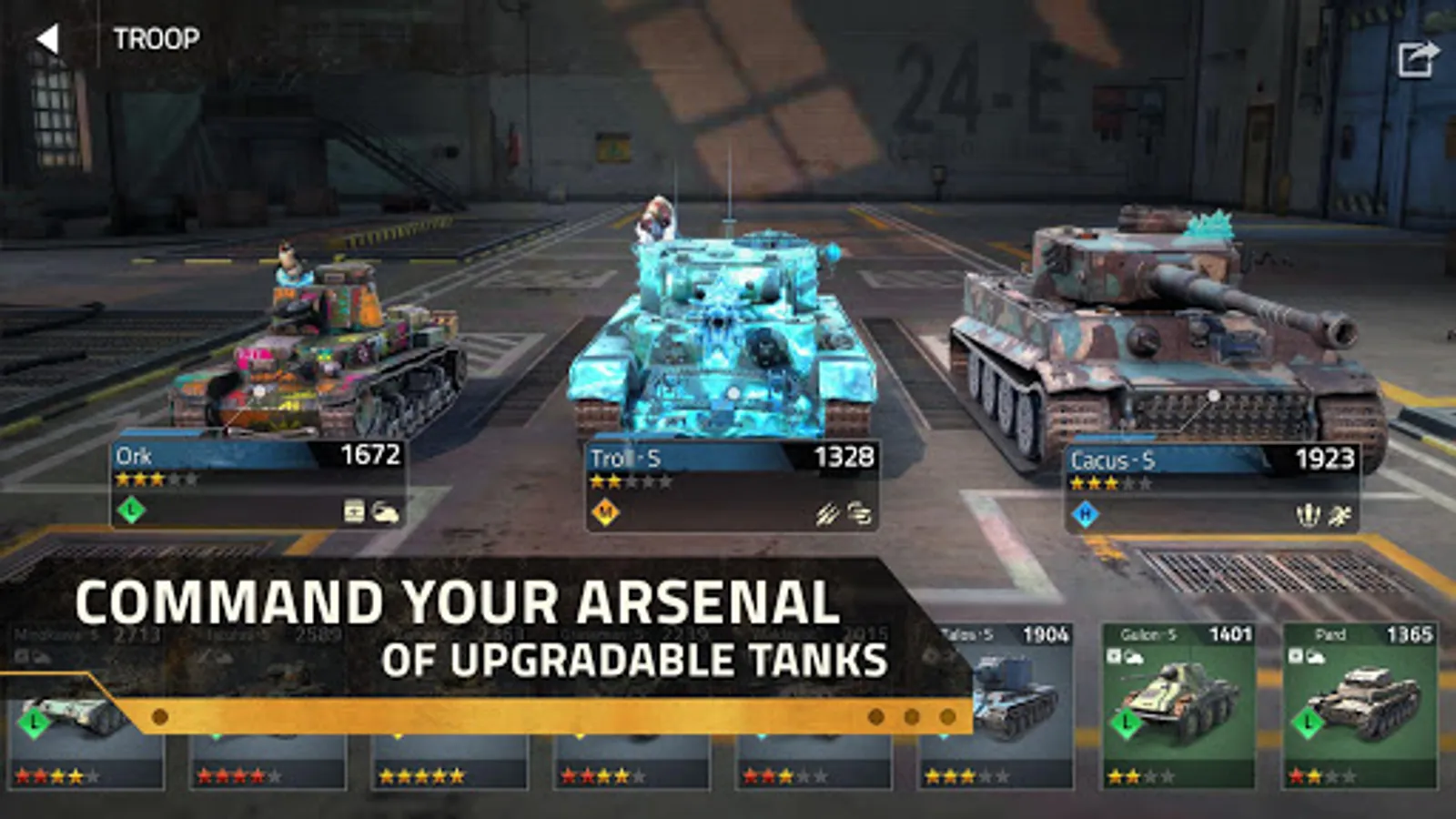 Start with a troop of three tanks, each with unique strengths and attributes, and carry out your squad’s battle plan. Upgrade your tank’s performance and execute the perfect strategy to dominate your competition. Plus, make progress in the Iron Pass to personalize your tank troop.
