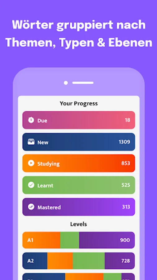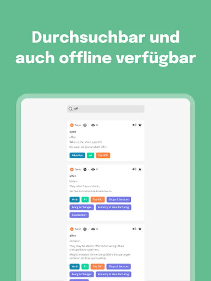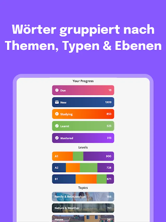 Filter by levels (A1, A2, B1, B2), topics, top 100 groups and parts of speech