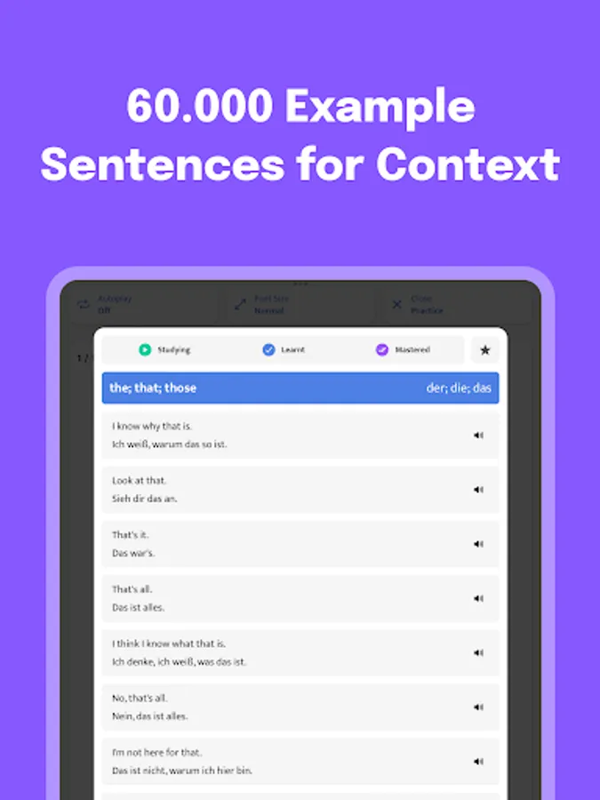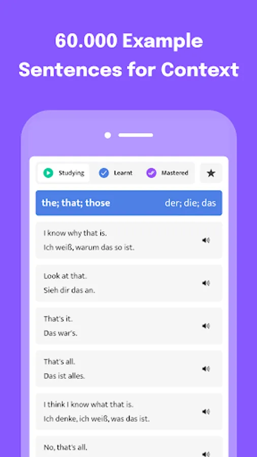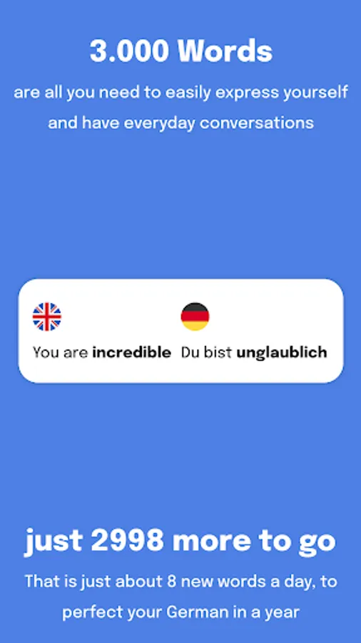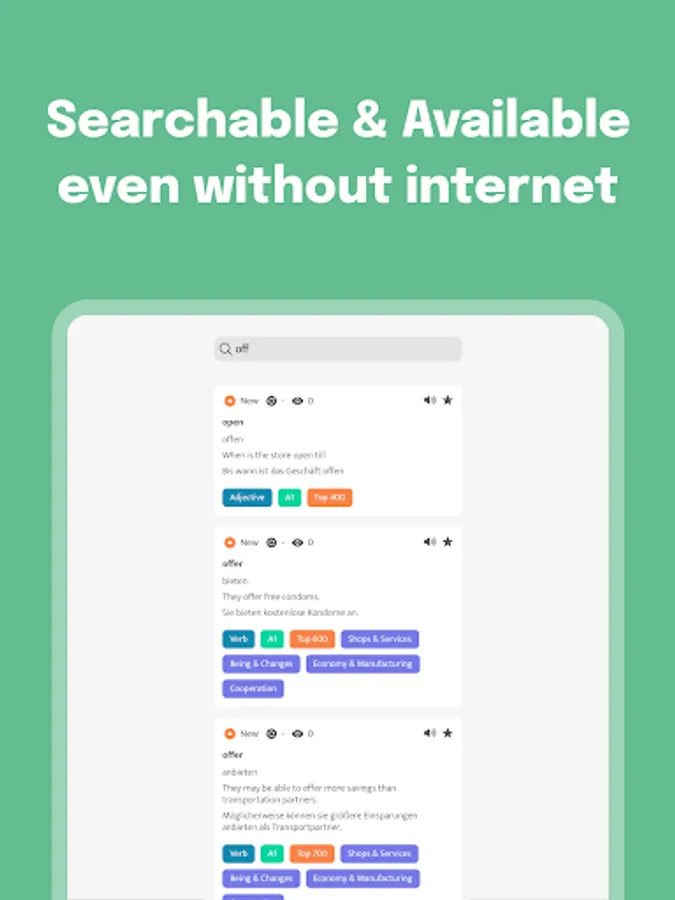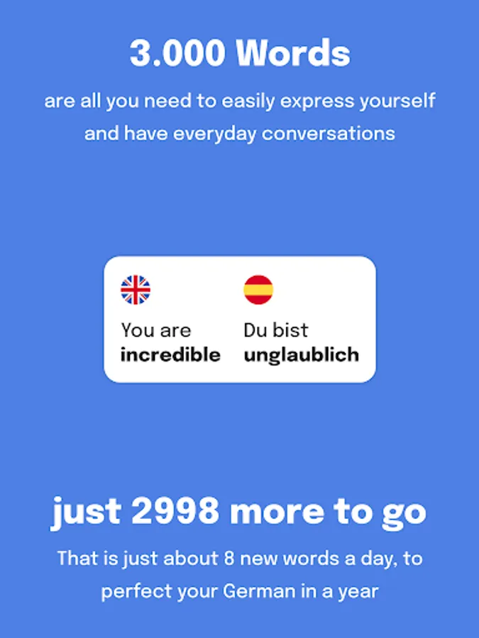 3000 words are all you need to easily express yourself and have everyday conversations in a language. This app has all the most common German ones, always available on your phone, even while offline.
