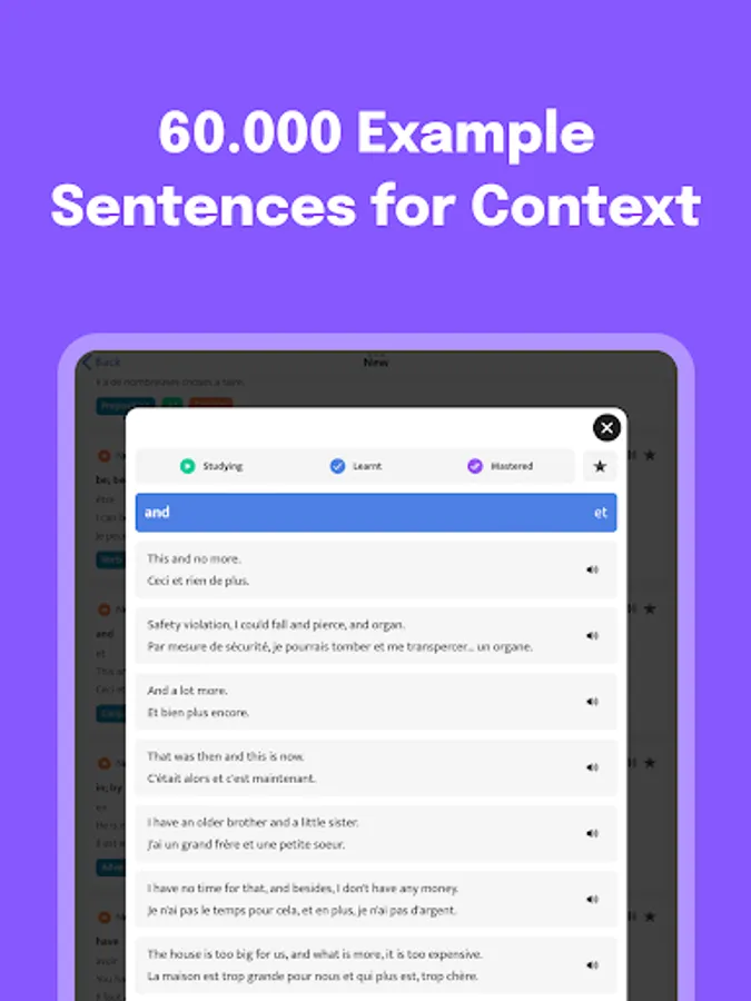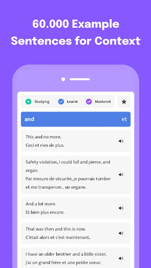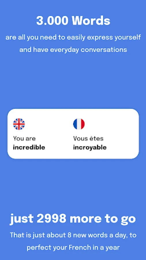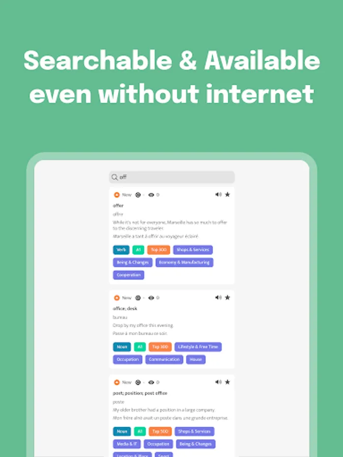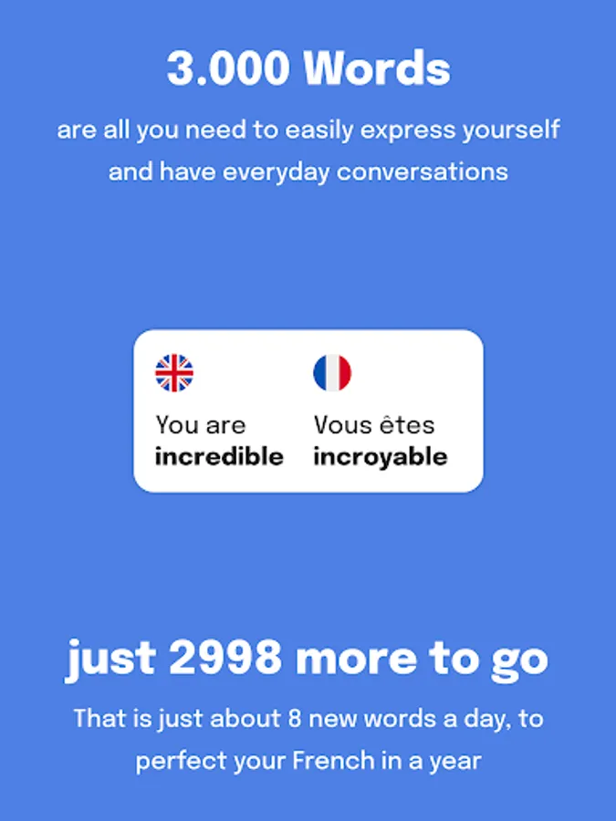 3000 words are all you need to easily express yourself and have everyday conversations in a language. This app has all the most common French ones, always available on your phone, even while offline.