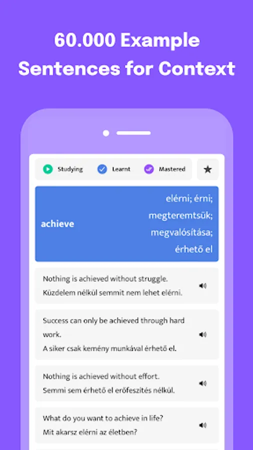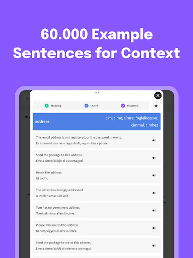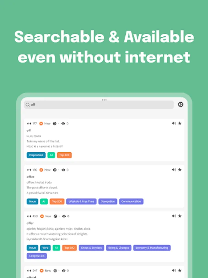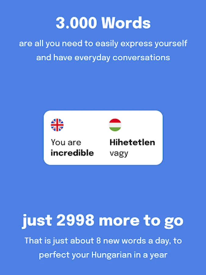 3000 words are all you need to easily express yourself and have everyday conversations in a language. This app has all the most common Hungarian ones, always available on your phone, even while offline.