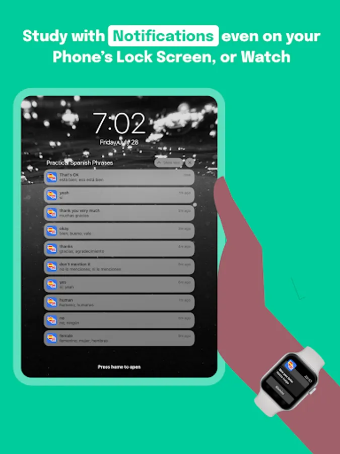 Study without even opening the app, even on your watch, with flexibly scheduled notifications