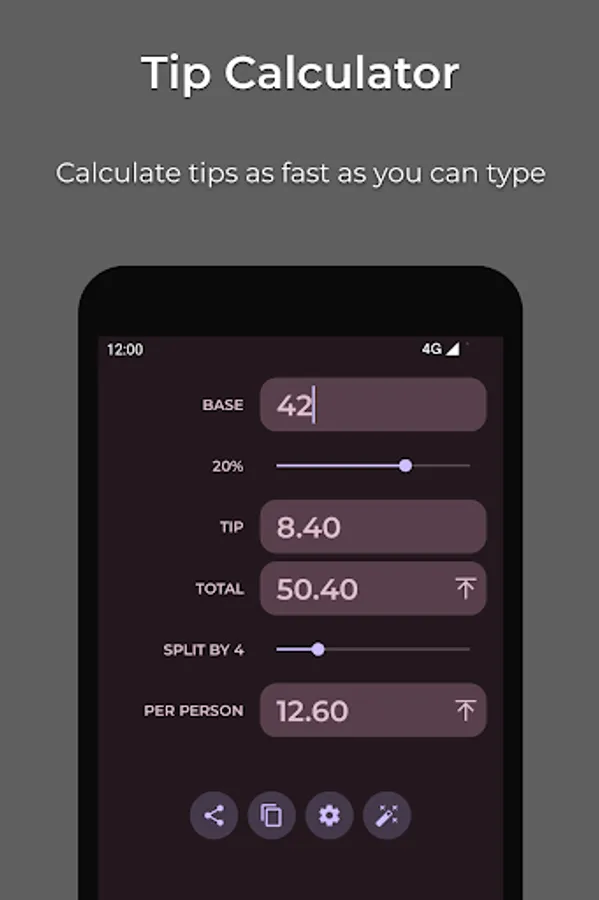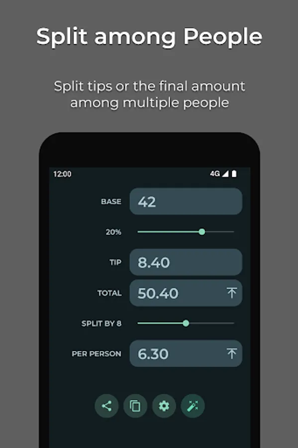 • Round Up: The tip percentage updates in real time when you round up the total or per-person amount.