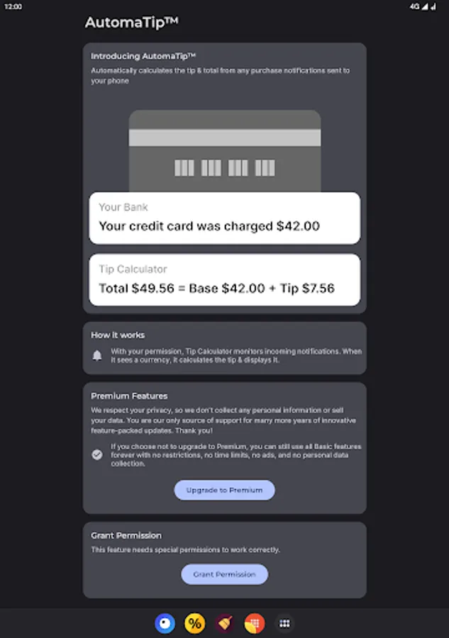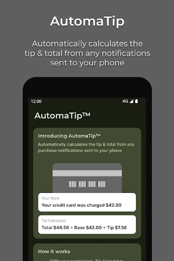 • Tip Calculator can listen for these incoming notifications, and can automatically calculate the tip & total and display as a notification.