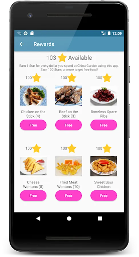 Earn rewards for every dollar spent. Once you earn 125 reward stars, use it to redeem for free food or cash back. App valid only at China Garden in Lewes, Delaware USA location.