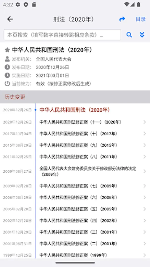 It contains more than 10,000 legal documents since the founding of the People's Republic of China, administrative regulations promulgated by the State Council, judicial interpretations promulgated by the Supreme People's Court, and departmental rules promulgated by the Ministry of Public Security, Ministry of Justice, Supreme People's Court, and Supreme People's Procuratorate. The content includes the full text of legal documents, the current effective state and historical change documents, which can accurately display the relationship between amendments and legal texts.