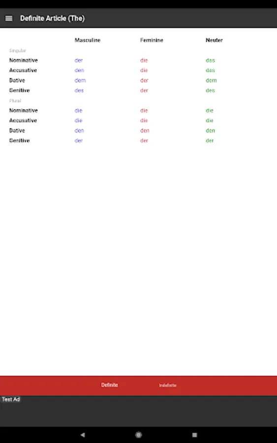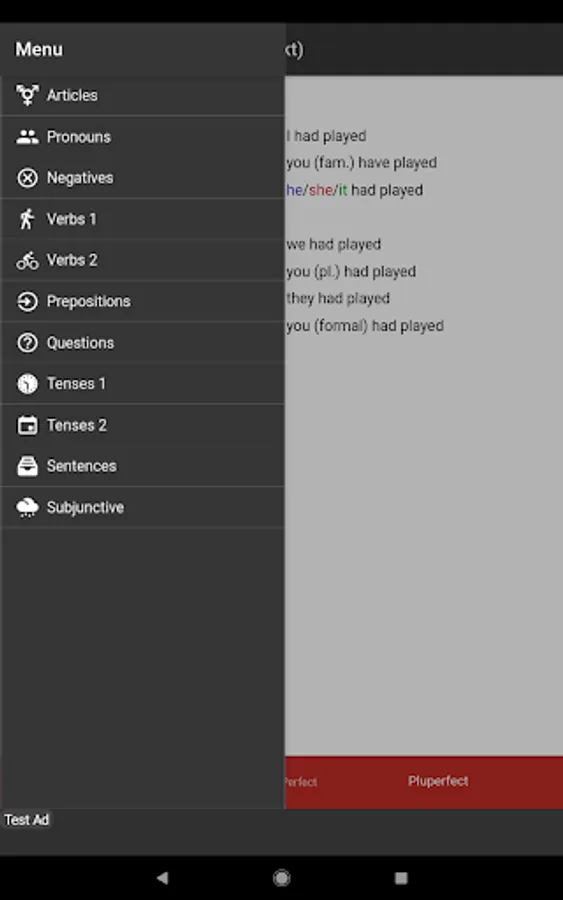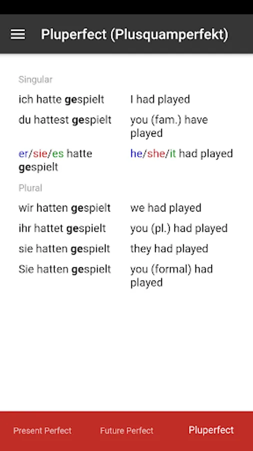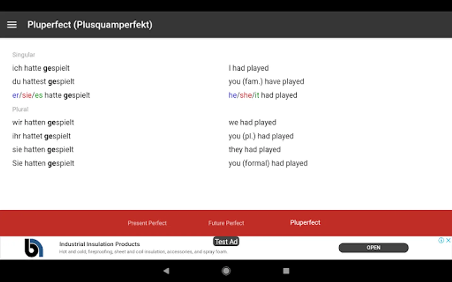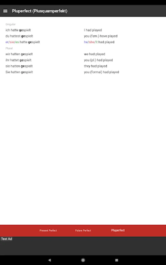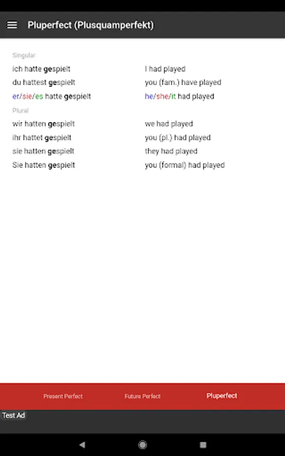 This app is also useful in conjunction with other study materials. Having the tables open on your phone or android device so that you don't have to continually flick back and forth through grammar books while doing grammar exercises. It is also convenient for revision and study in short periods of time in almost any location.