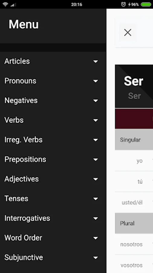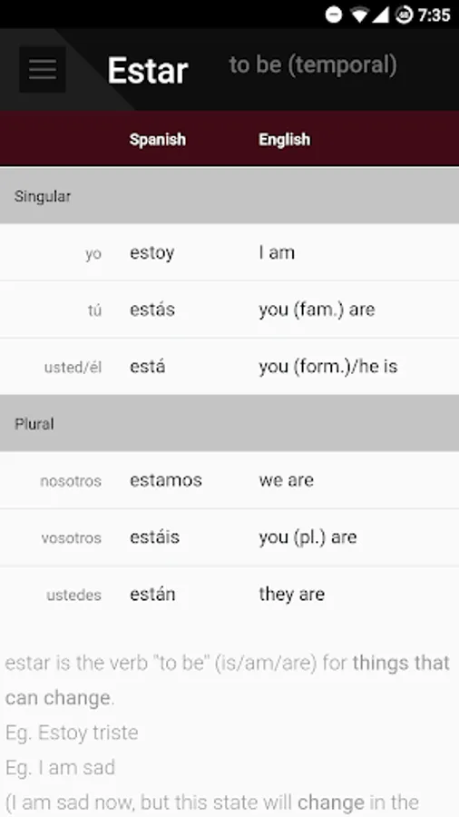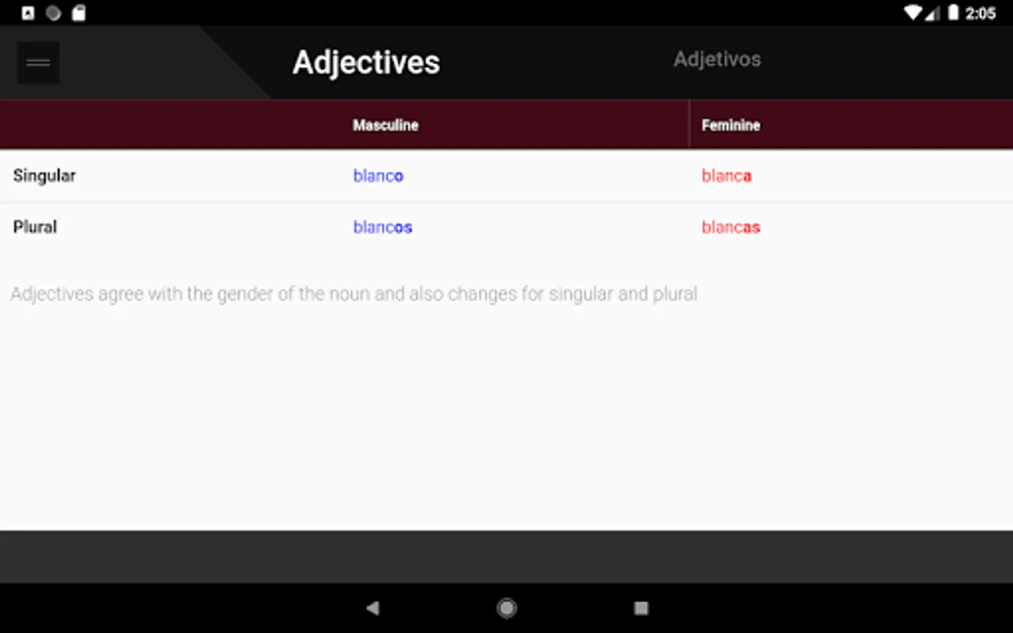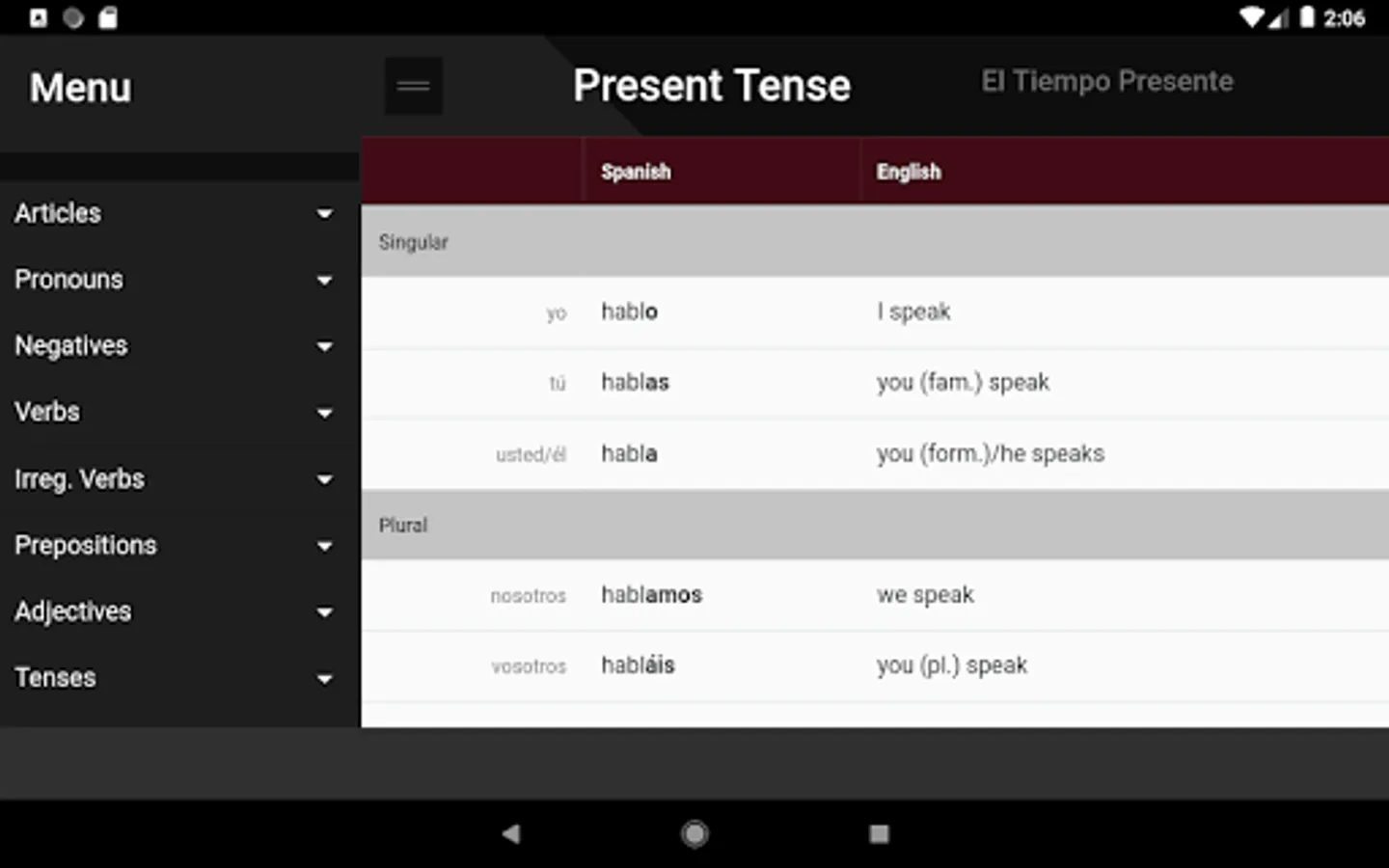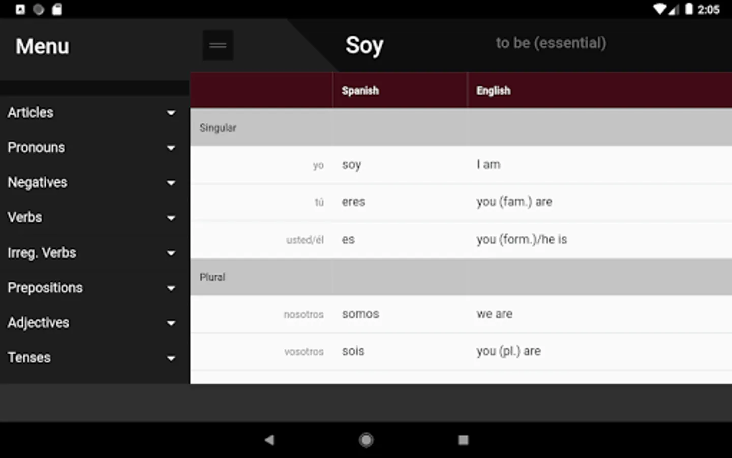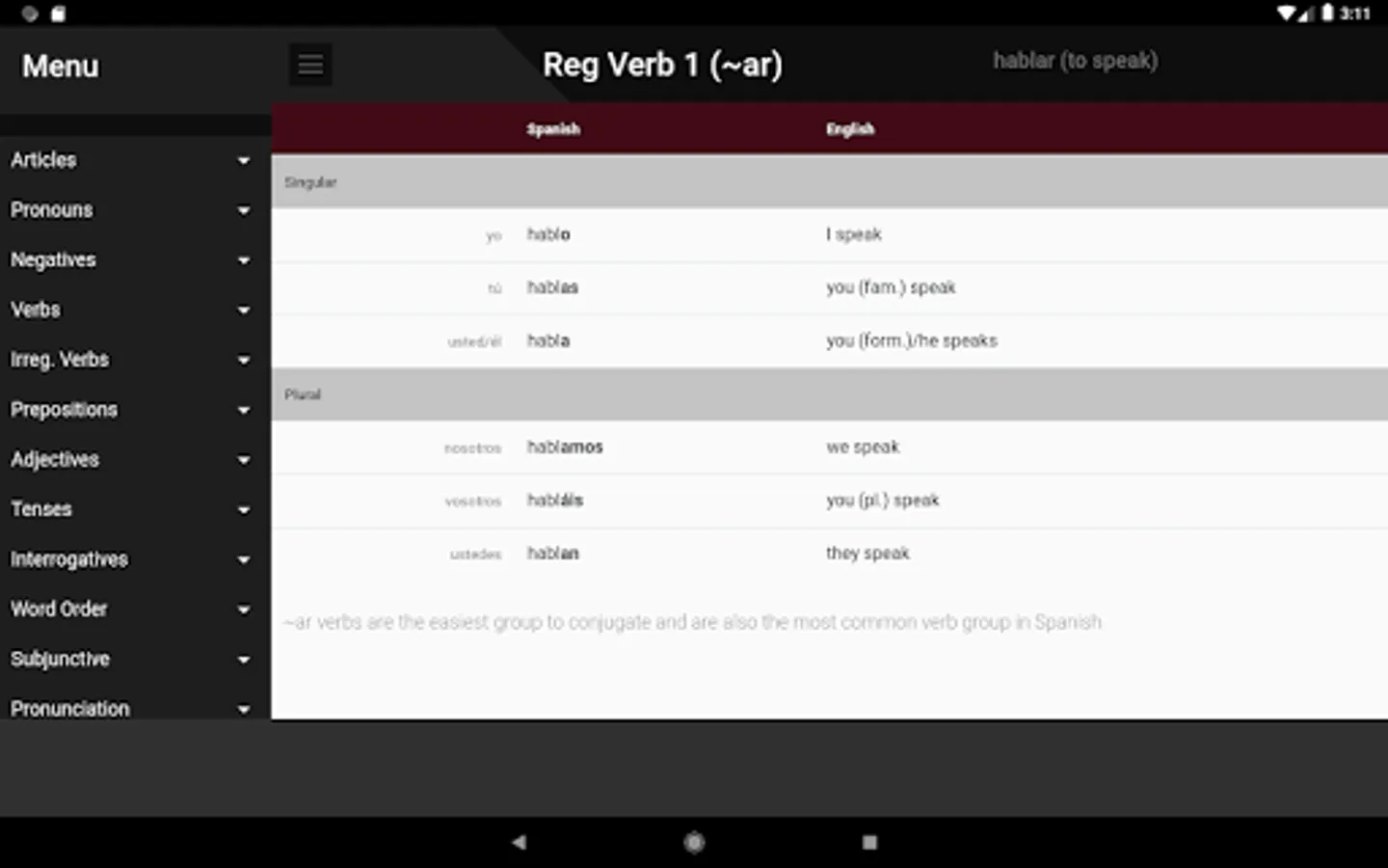 For travel, business, school work or fun, this app can help you learn Spanish, with verb conjugation tables, notes for verbs such as ser and estar, pronouns, articles, adjectives adverbs and almost everything else that is important in a solid base for learning and understanding Spanish grammar.
