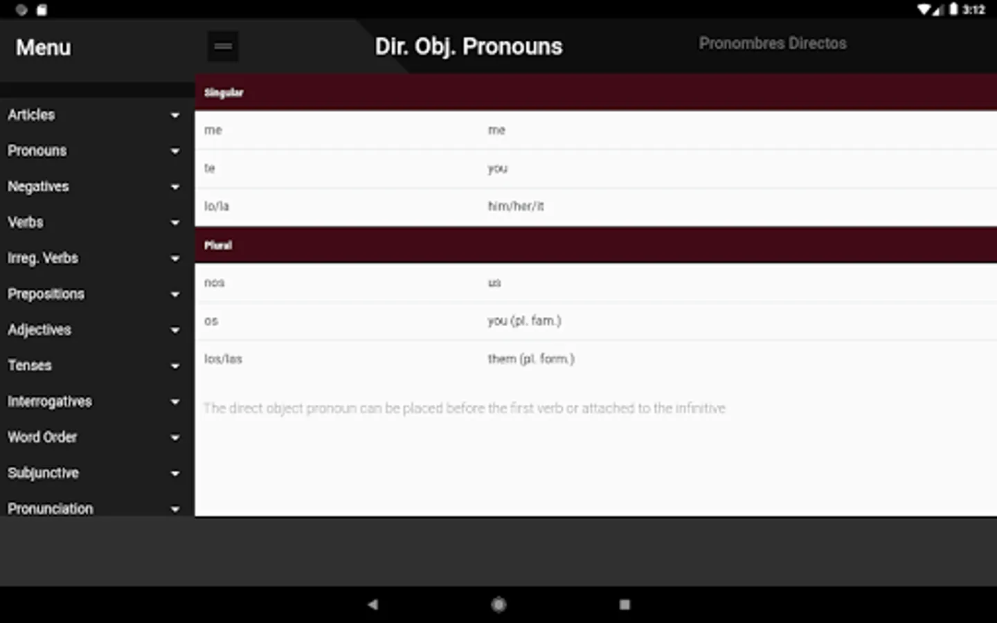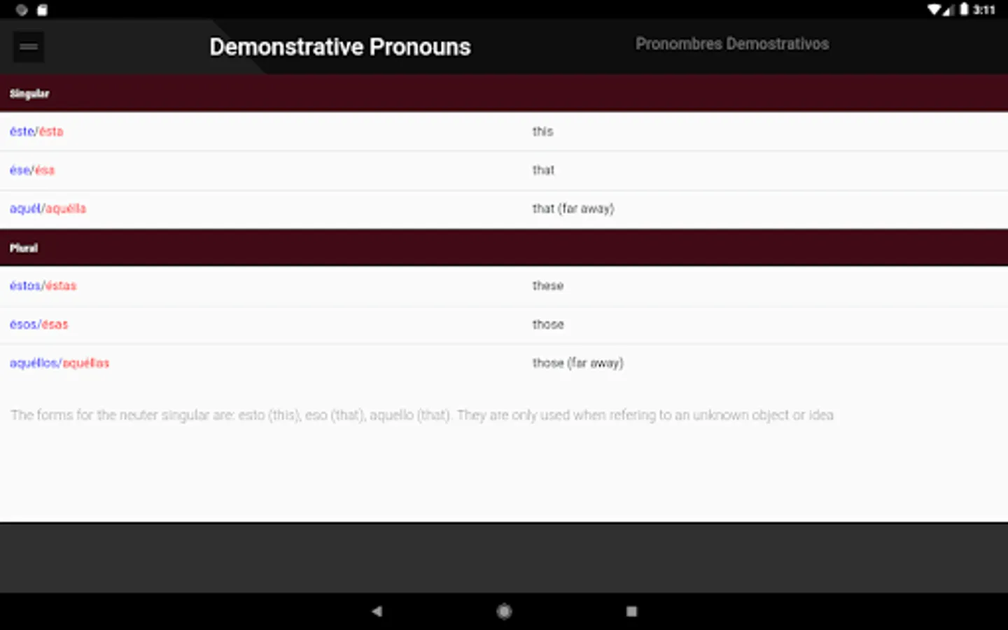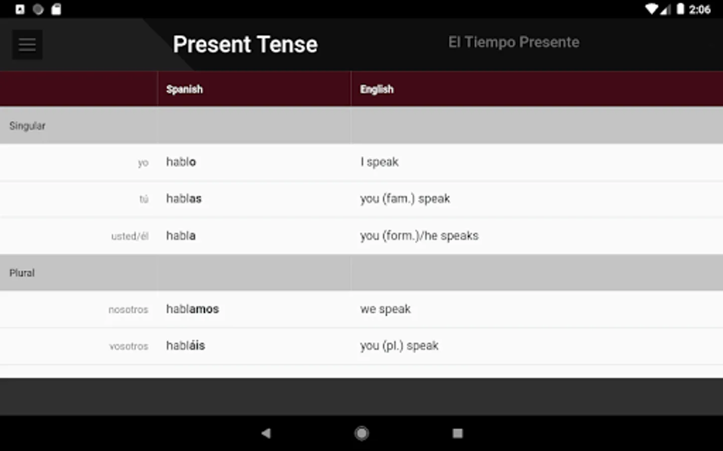 TAGS: spanish grammar free, simple spanish, easy spanish grammar, best spanish, study, learn, simple spanish, simple grammar, spanish for beginner, grammar tables, android app, fast, quick, offline, online, Spain, Latin America, South America, DELE, business, travel, tourism, university, school, fast spanish