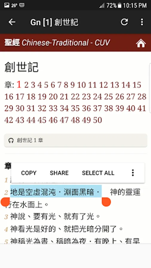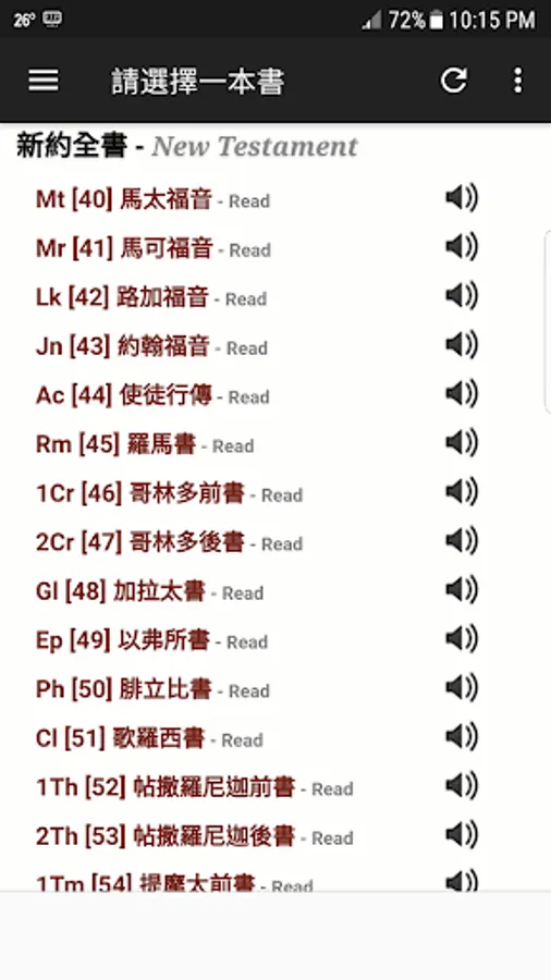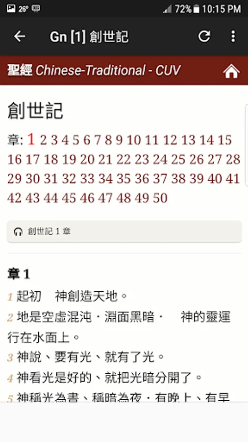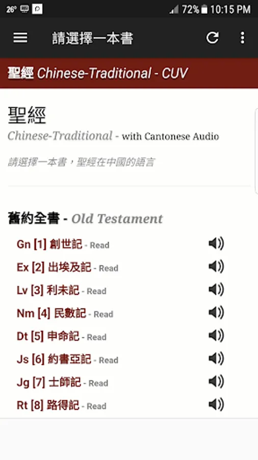 Chinese Bible. 聖經 - This is the best free android application about Chinese Traditional (Cantonese) Bible in Chinese Union Version. Chinese Union Version is the predominant translation of the Bible into Chinese used by Chinese Protestants. This Chinese Bible app comes complete with text and audio Bible, all chapters of New and Old Testament. It has Cantonese Bible. In order to play the audio, Cellular or Wi-Fi network should be enabled. However, you still can read the Bible in offline mode. With this Chinese Bible Traditional app you can read and listen to the words of God at the same time wherever you go. User Interface is designed for easy usage. This app is perfect for Chinese people around the world who wants to read and hear the Bible in Chinese Traditional (Cantonese) language. Please feel free to use it and send me recommendations to improve the app. Thank you. God Bless You!