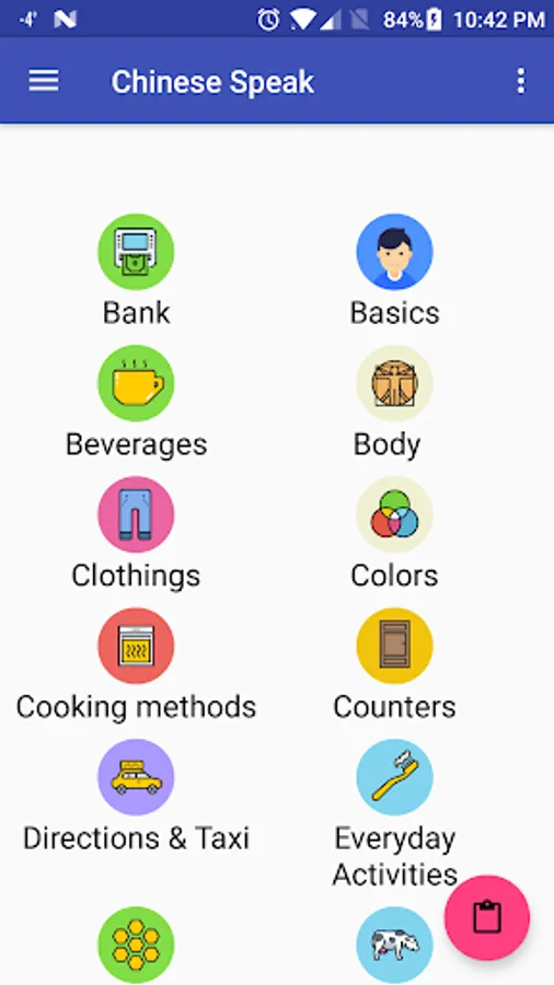School, Bank, Basics, Beverages, Body, Clothing, Colors, Cooking methods, Counters, Directions & Taxi, Everyday Activities, Food Basics, Grocery - Dairy, Grocery - Dry goods, Grocery - Fish & Meat, Grocery - Fruits, Grocery - Spices & Preserves, Grocery - Useful, Grocery - Vegetables, House, House - Bathroom, House - Bedroom, House - Dining room, House - Kitchen, House - Living Room, Job Status, Money, Numbers, Occupations, People, Places, Restaurant - Chinese, Restaurant - Dim Sum, Restaurant - Useful, Shopping, Sports & Recreation, Study, Tech & Gadget, Time - Days of the Week, Time - Months of the Year, Time - Years, Time of Day, Travel & Transportation, Useful Adjective and Weather, Climate Seasons.