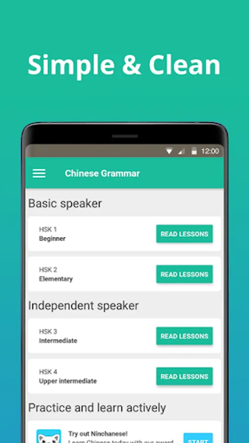 The Chinese grammar app has handy Chinese lessons offline to answer any questions you might have about the Chinese sentence structure and grammar rules classified by levels. It's better than a Chinese grammar book since you can always have it on you.