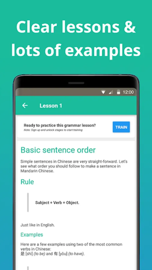 Every lesson is explained simply with Chinese sentence examples and Pinyin. All lessons are accessible with no ads, no sign-up, and offline.
