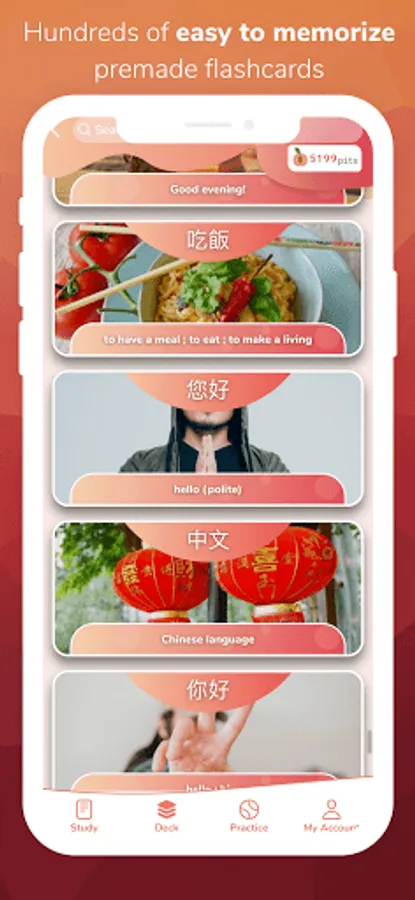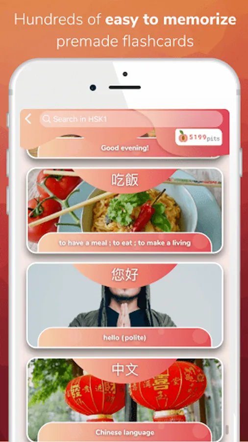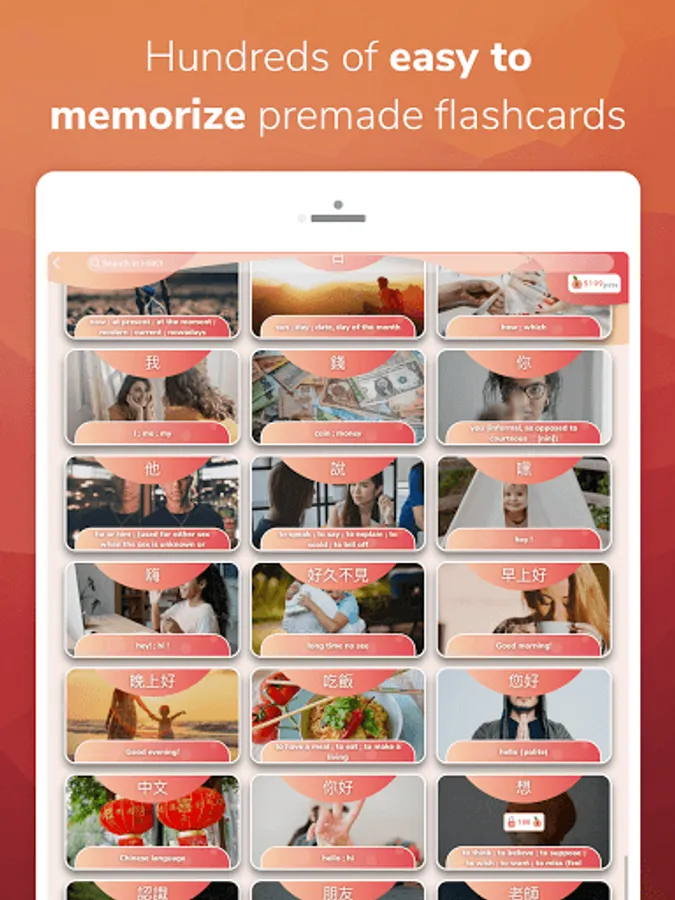 Hundreds of detailed, illustrated and contextualized pre-made flashcards are available.