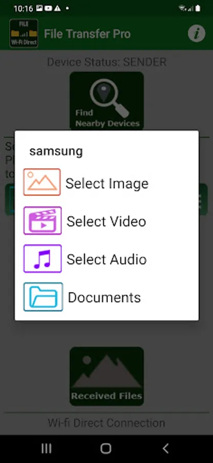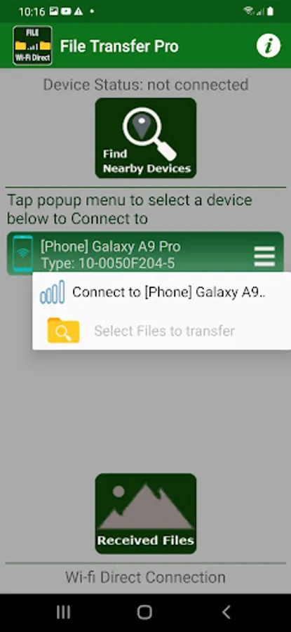 When connection is established, the app shows a popup menu with command "Select Files to transfer" high lighted and ready to send the selected files.