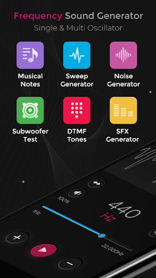 Frequency Sound Generator is an easy and simple to use sound wave generator and frequency oscillator. It allows you to generate a sine, square or saw tooth and triangle sound wave with frequency ranging from 1Hz to 22000 Hz (hertz). You can also set your desired frequency by pressing +/- βStepβ buttons.