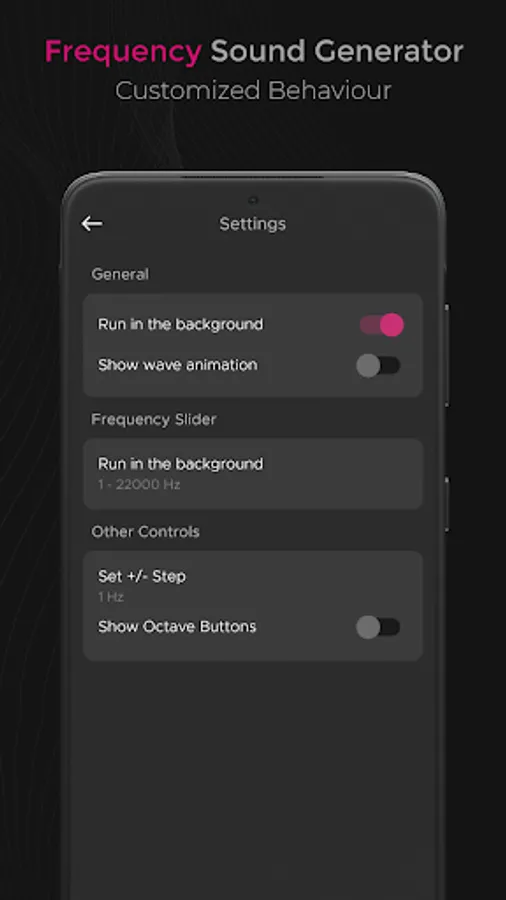 In the frequency generator app settings, you can choose if you want the frequency sound to continue playing in the background when you minimize theFrequency Sound Generator app.