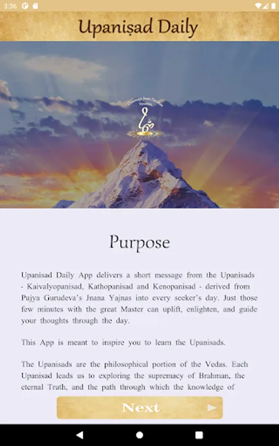 Upanisad Daily is a short message from the Upanisads - Kaivalyopanisad, Kathopanisad and Kenopanisad - derived from Pujya Gurudeva’s Jnana Yajnas. Just those few minutes with the great Master can uplift, enlighten, and guide your thoughts through the day.