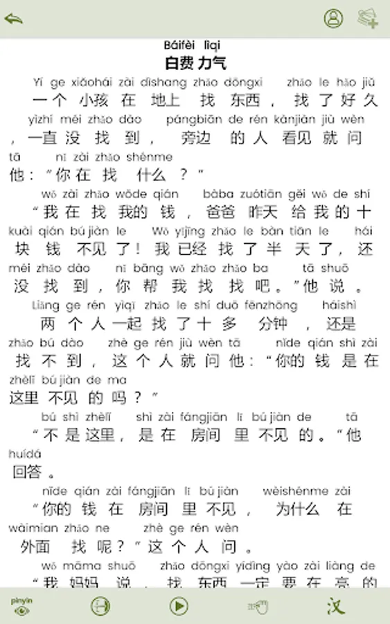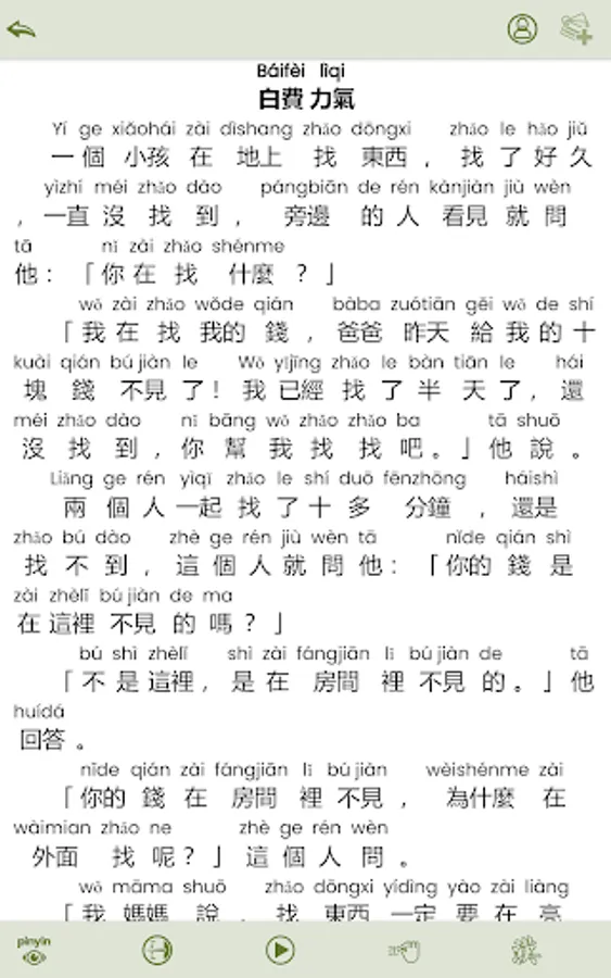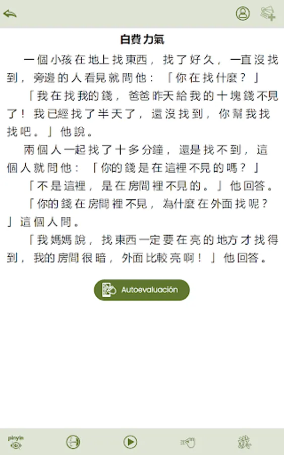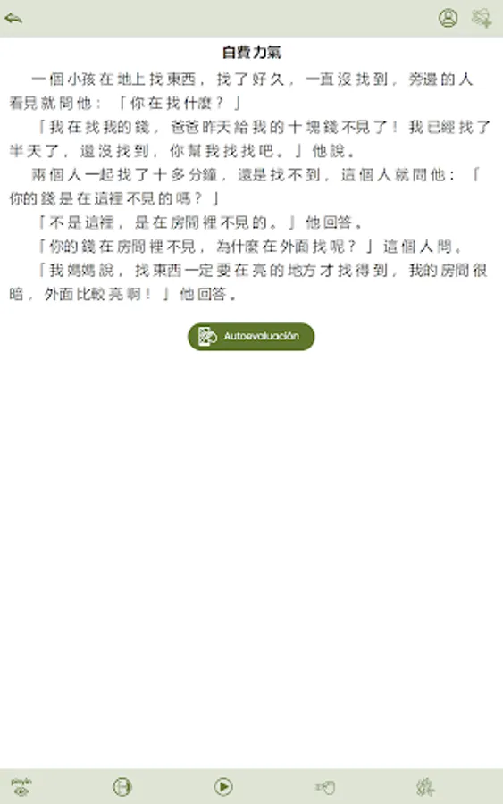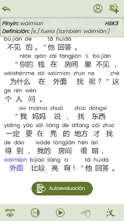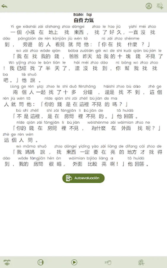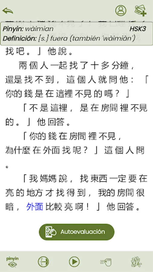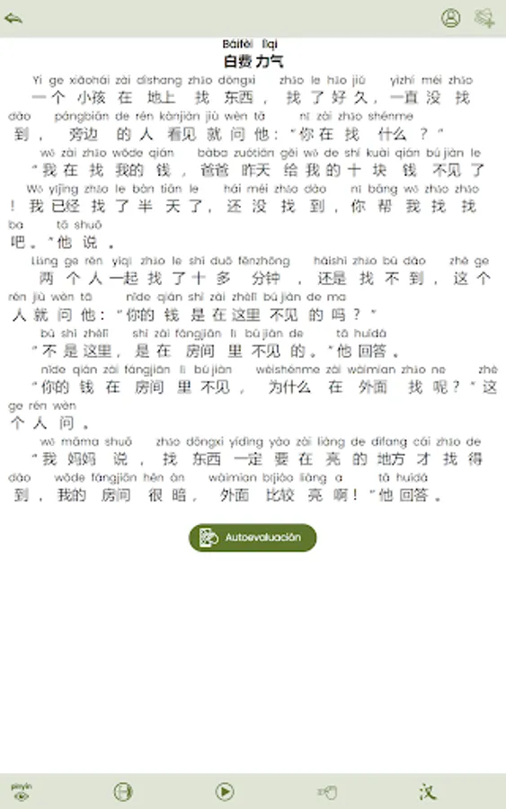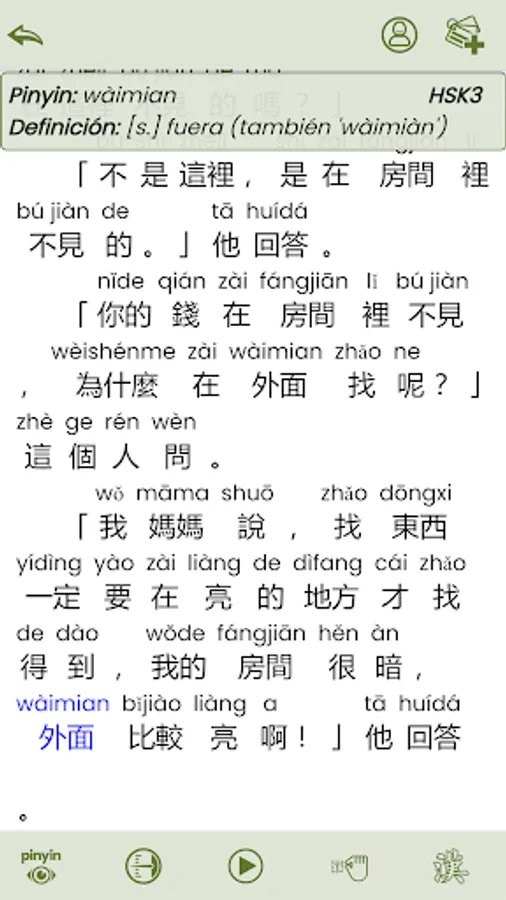Chinohispano is an easy-to-use application. You can only listen to an audio recording (the audios have the real accent of a native person) or you can also read the texts with or without pinyin, written in simplified (used in China, Singapore and Malaysia) or traditional (used in Hong Kong) characters. Kong, Macao and Taiwan). Touching any word in a reading you see its instant translation as well as grammar explanations. Both the vocabulary and the sentences have been carefully translated and remain as faithful as possible to the original Mandarin.