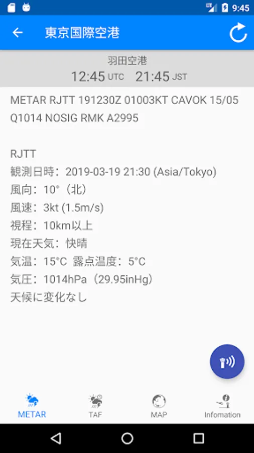 定時航空実況気象通報式、または定時飛行場実況気象通報式と呼ばれ、飛行場の現在の天気を知ることができます。航空気象情報を英数字によって通報するための書式です。