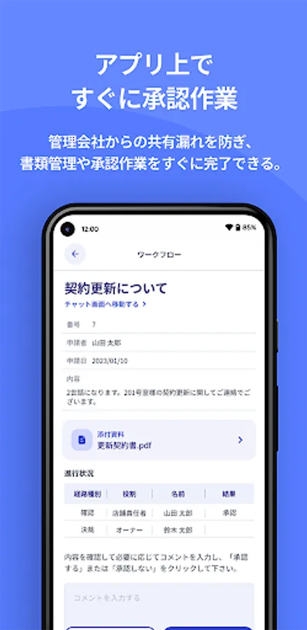 By simplifying information transmission, sharing omissions from the management company can be prevented, and document confirmation and approval work can be completed in no time wherever you are.