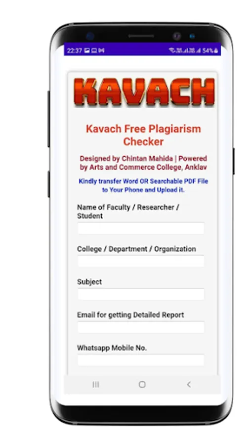 Kavach Plagiarism Checker is an Android App to find out Plagiarism Content in Thesis, Dissertation, Projects, Research Paper, Assignments or in Any Manuscript. It is one of the finest and the most accurate academic plagiarism checking android applications developed in India. It is developed by Chintan Mahida who has developed many useful android app like UGC API Calculator, Merit Calculator, Merit Based Calculator and many more. Kavach Plagiarism Checker uses advanced DNA Scan Technology which can search copied content from internet, Sodhganga, popular books resources and thesis & research around the world. It is promoted and powered by Shree S.D. Patel Arts and C.M. Patel Commerce College, Anklav. Currently, it supports only English Language. We are trying our level best to include multilingual Script support.