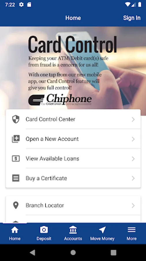 Our new mobile app provides members convenient access to Chiphone Federal Credit Union's mobile website, mobile check deposit, mobile banking, branch & contact information, and help.