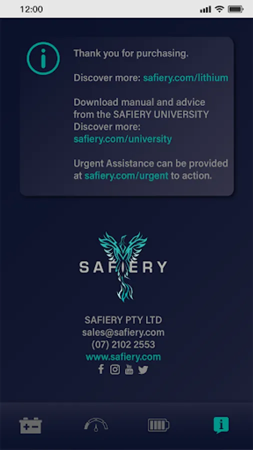 This app connects to a Safiery Lithium battery via Bluetooth. Only one user can be connected at a time. If more than one battery is installed, the app will show individual batteries. It does not communicate with two batteries at the same time. Once connected, data is transferred from the battery to the smartphone app. The Summary data includes battery voltage, battery current and battery status. Scrolling down will show a detailed description with images. These info-graphics show current, number of cycles, temperature and alarms. The alarms show high and low voltages, high charge and discharge current conditions. The Voltage of the cells is shown in 4 info graphics. Adding these voltages equals the overall battery voltage at the top of the app screen. If there is a cell imbalance, it will be visible. The last section of the app screen shows the support link and contact details for support