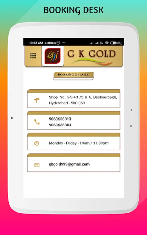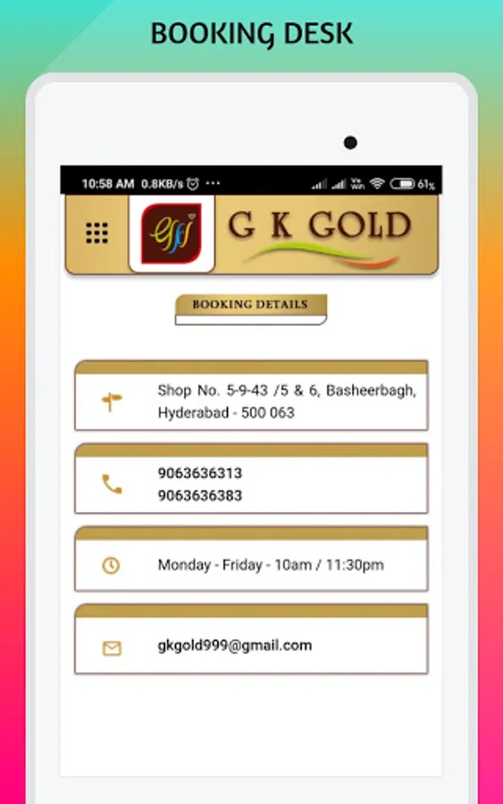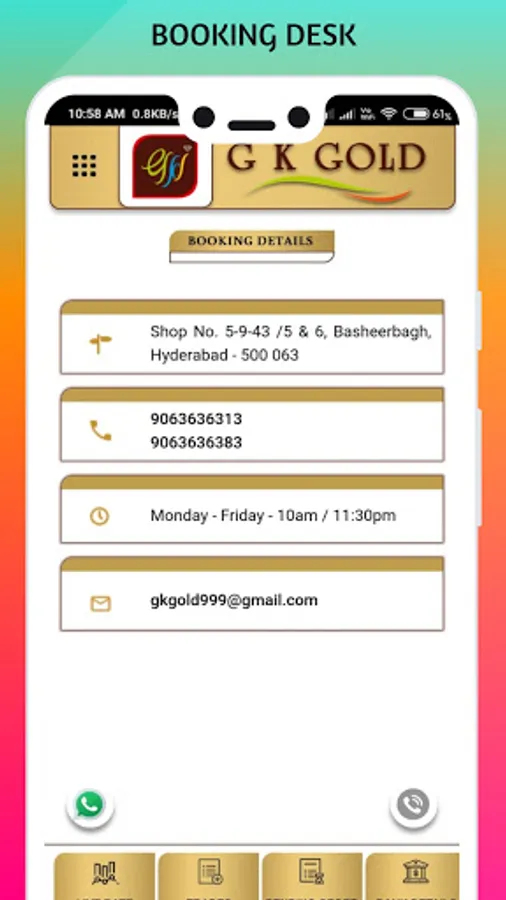 The contact details of our company such as an address, telephone numbers, mobile numbers, email I'd, website details are all mentioned under BOOKING DESK