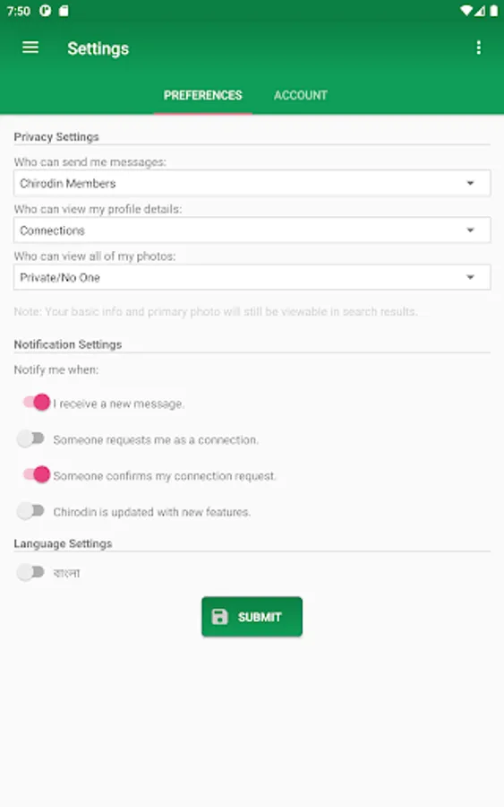 Chirodin is a free marriage application for Bangladeshis worldwide. Search, connect, block, and chat with other members. Control who gets to see profile details and photos using privacy controls. Both Bangla and English languages are supported. The app is straight forward and completely free to use.