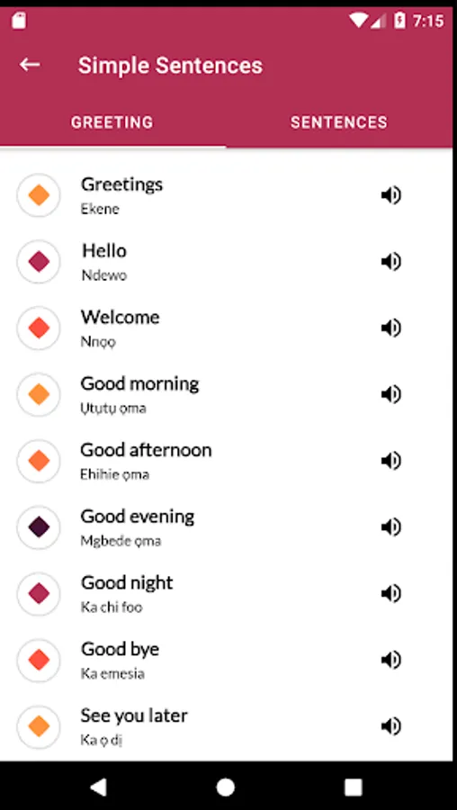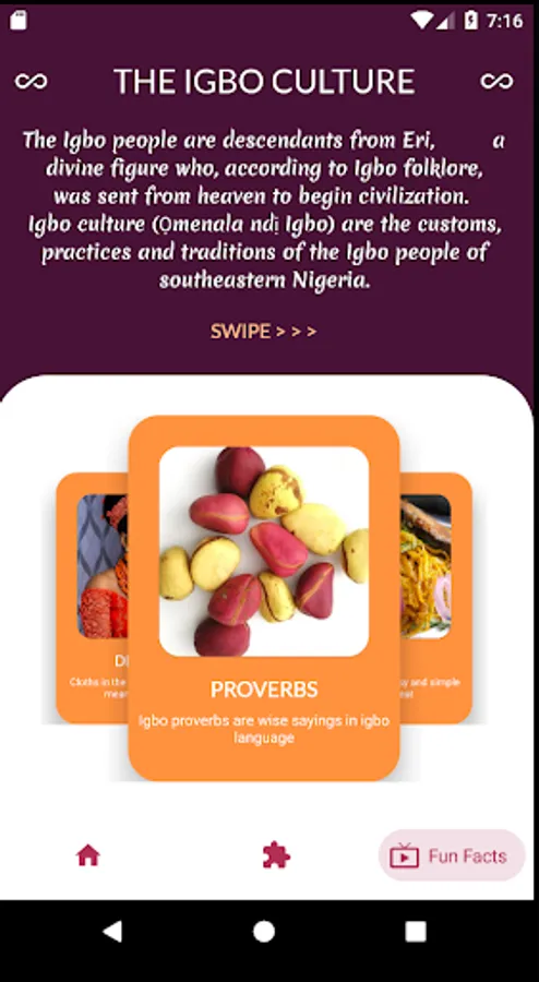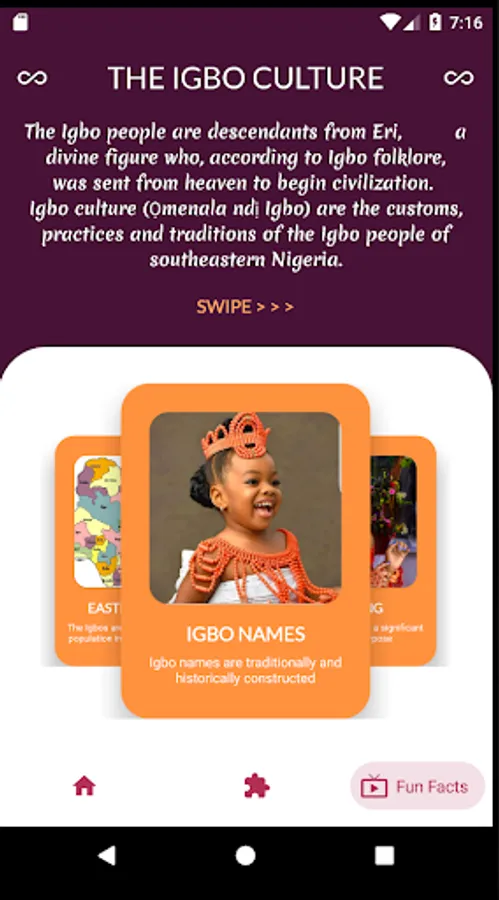 Igbo Amaka features audio pronunciations, learning checks, attractive images, and fun facts about the Igbo Culture which includes dressing, food, proverbs and Igbo names.