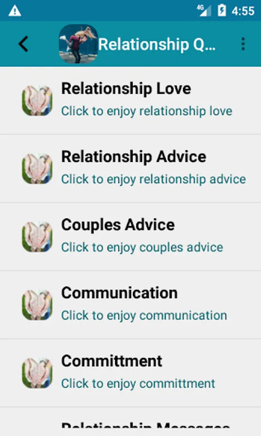 This application, Relationship Quotes , provides messages that are application in day to day life of a romantic relationship. We want you to say as you want it, as you feel it.