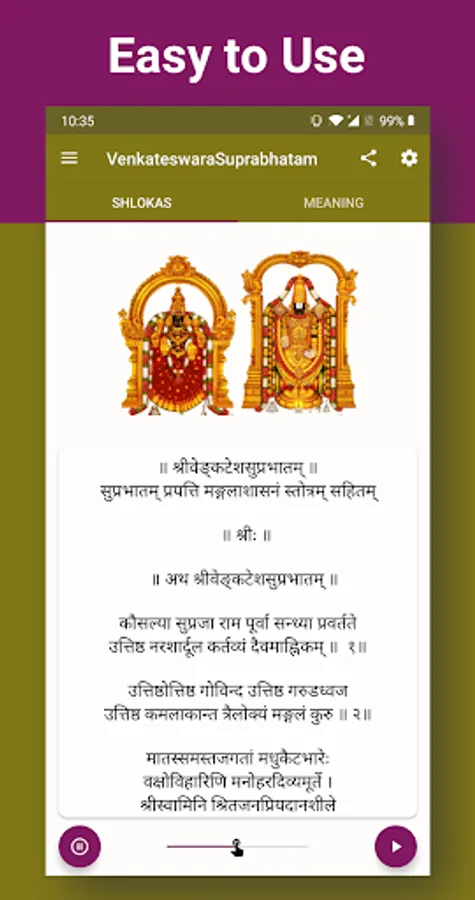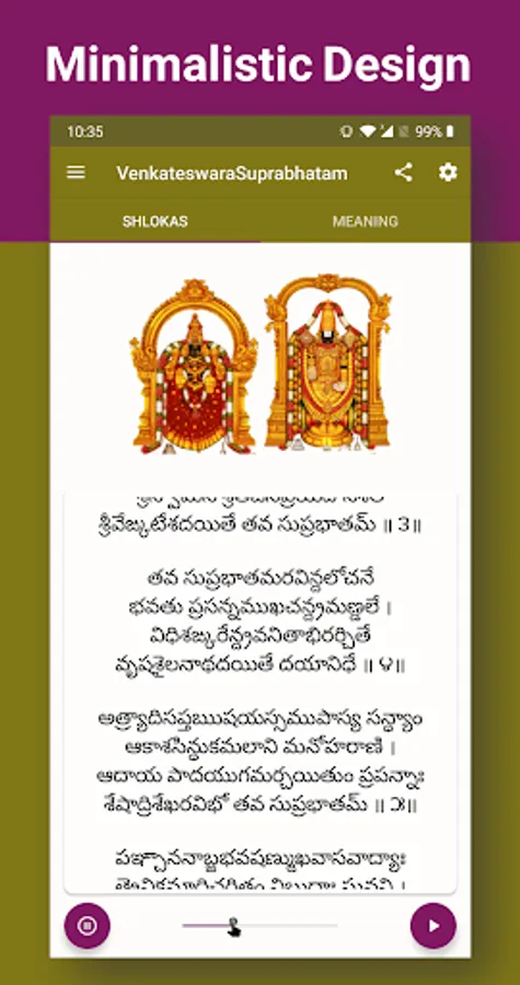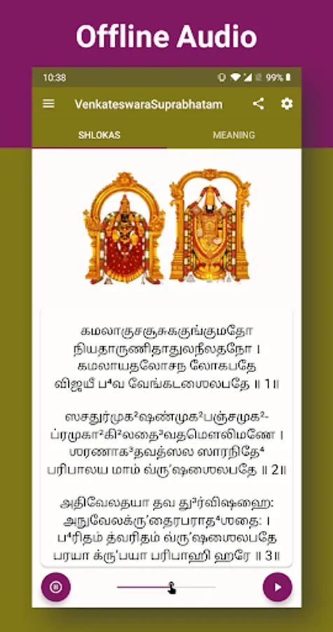 🚀 The audio of Venkateswara Suprabhatam can be paused and resumed without any glitch. And the audio can also run on the background if you want to use your phone for some other activity simultaneously.
