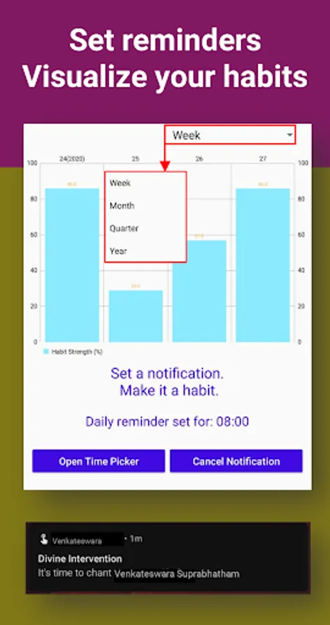 🚀 You can set reminders and monitor your daily chanting habits too. The habit chart motivates you to not break the chain and help you chant the shlokas without fail.