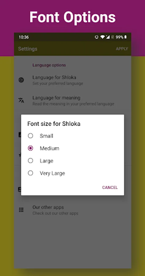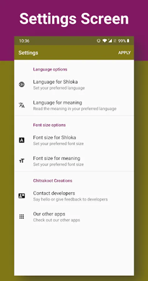🚀 The language and font preference for the lyrics need not be specified every time you open the app. Once set, the app will remember your preferences, making it a hassle free experience.