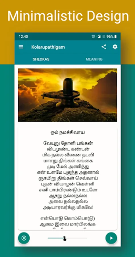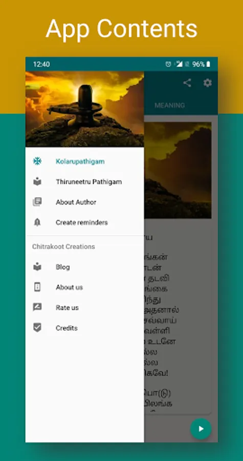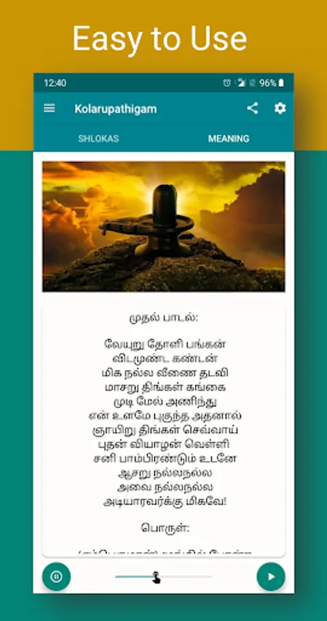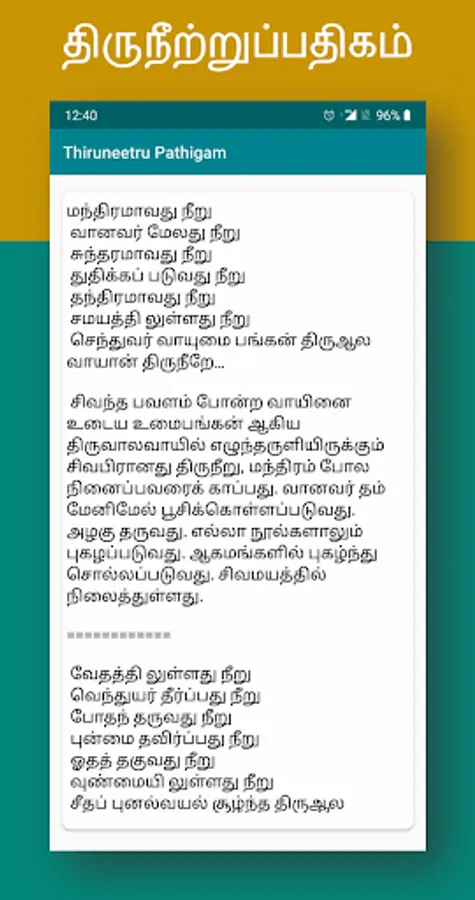 Read and listen to the Kolaru Pathigam & Thiruneetru Pathigam through this app without any ads and disturbances.