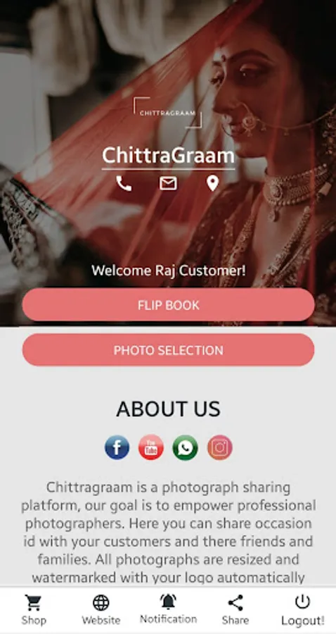 Chittragraam is a photograph sharing platform, our goal is to empower professional photographers. Here you can share occasion id with your customers and there friends and families. All photographs are resized and watermarked with your logo automatically in application, other cool components are photographs selection, face detection, flip Album, video Sharing, shop for personalised gifts, and live slide shows for occasions. Our mobile application and website is personailised for every photographer. Take your business to the next level, only with Chittragraam.