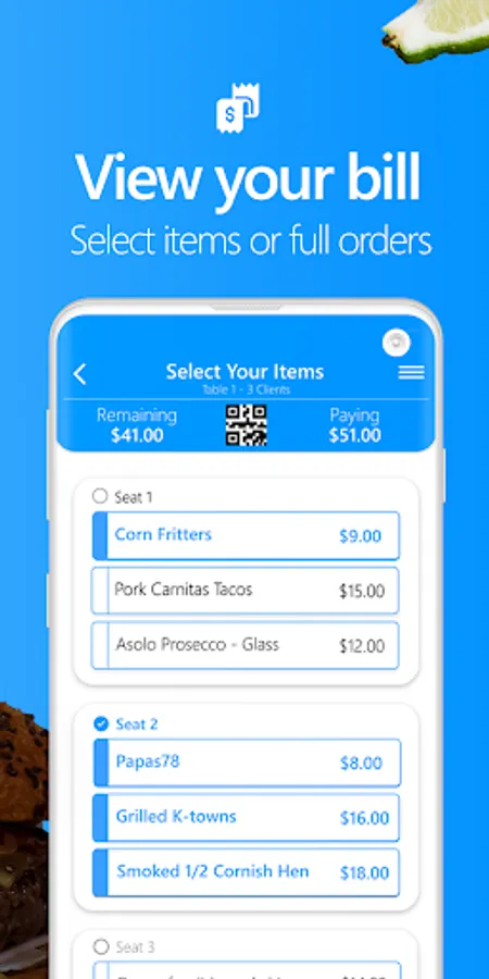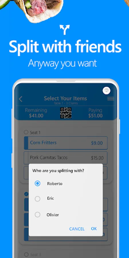 • Split your bill with friends in any way. Split individual items (like that bottle of wine Suzy claims she didn't drink), entire orders or the whole bill.