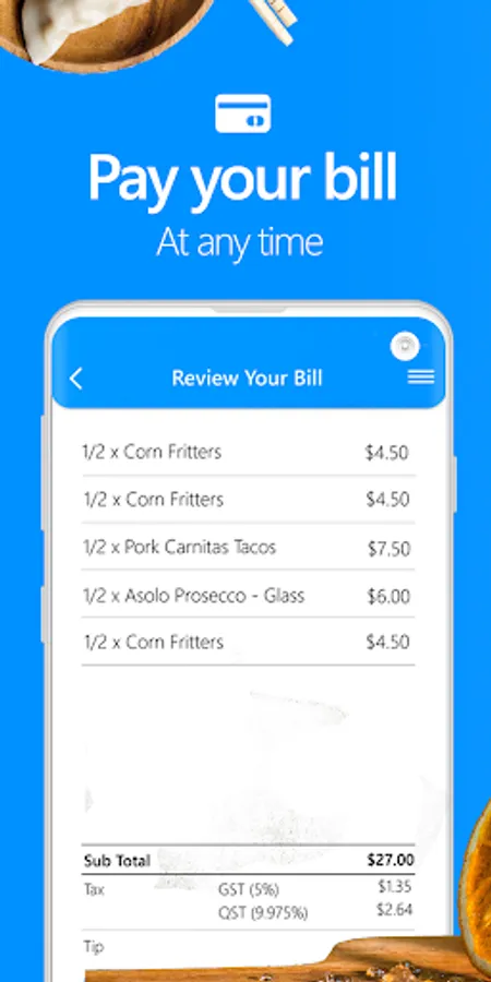 • View your bill in real-time through the app as soon as you order with your waiter.